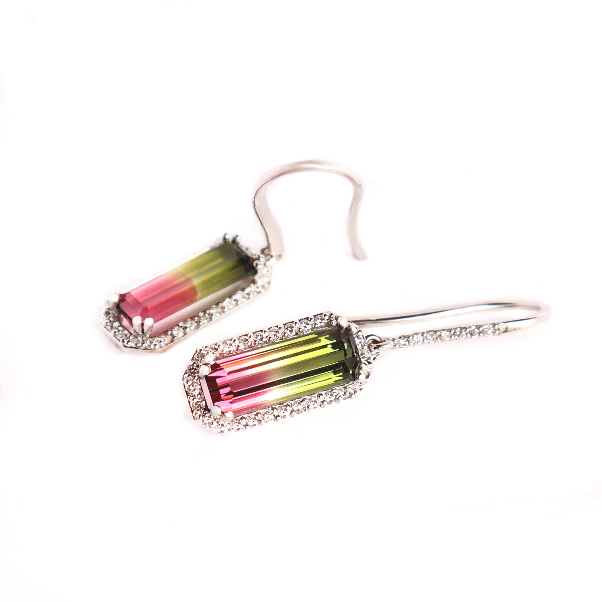Each baguette-cut watermelon tourmaline fades from fresh green to ripe pink. Framed in sparkling diamond halos and dangling from a delicate pavé diamond ladder, they sway with the kind of confidence that turns heads across manicured lawns and moonlit ballrooms.