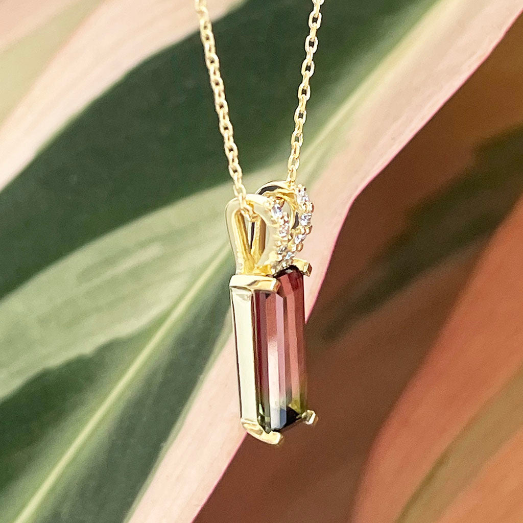 A pendant for stolen moments and sunlit secrets. This sophisticated piece features a 1.59-carat baguette-cut watermelon tourmaline, shifting from delectable pink to soft green in a single, mesmerising stroke. Cradled in rich 18-carat yellow gold, the stone is suspended from a diamond-studded split bale, adding just the right glint of opulence to catch the eye—and hold it.