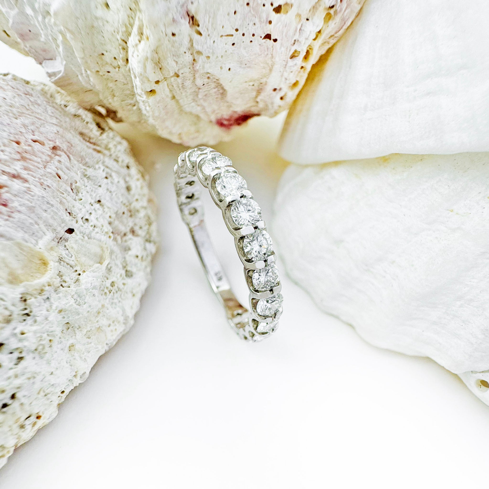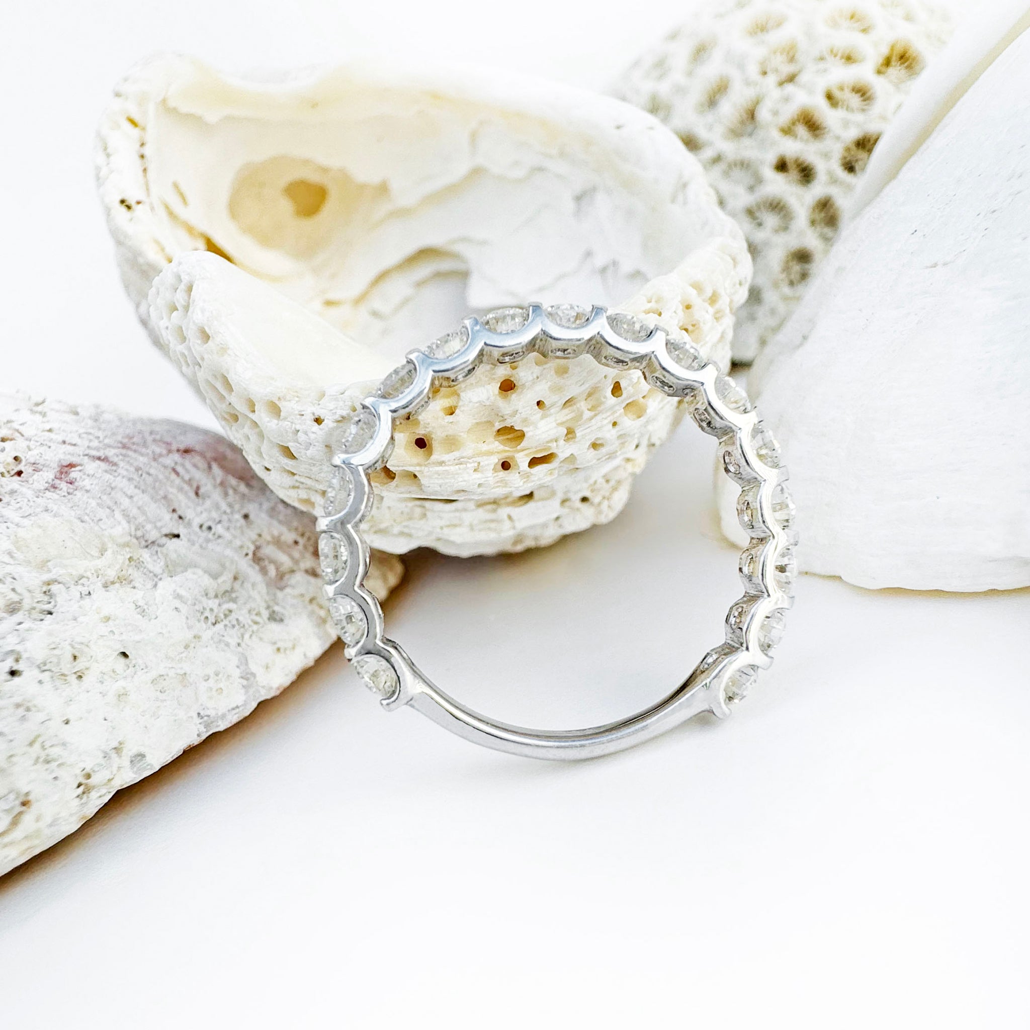 This sublime eternity ring is set with 17 brilliant white diamonds that encircle three quarters of the band. The base of the shank is not set with stones for a comfortable fit perfect for the demands of a modern lifestyle.