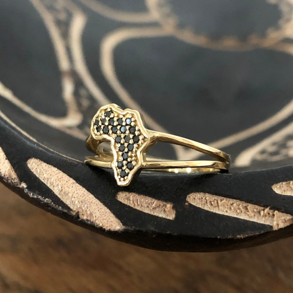 This sublime ring celebrating Africa is set with 20 black diamonds and gold beading in a nod to traditional craftsmanship. The split band and the continent's border are cast from polished nine-carat yellow gold. It's a piece that encapsulates the glamour of contemporary Africa.