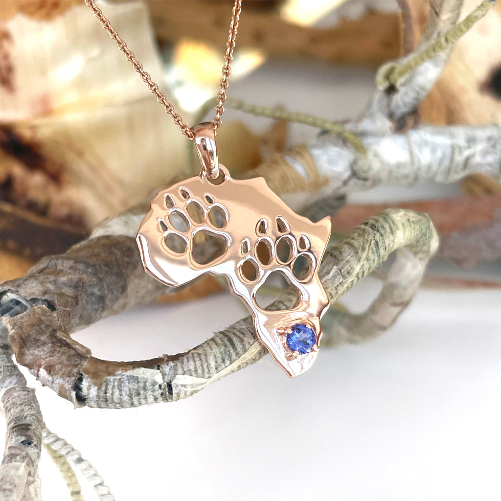 Africa Map Cut Out Paw Prints with Tanzanite in Rose Gold