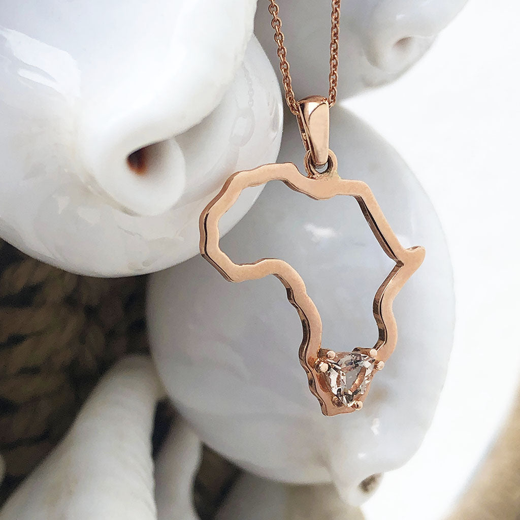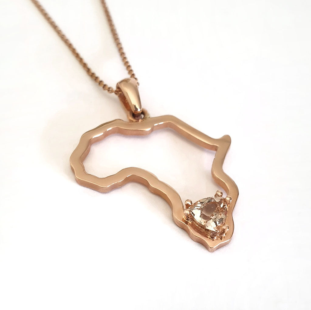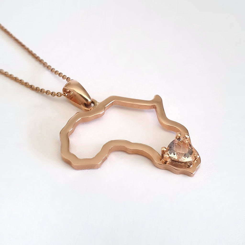 This exquisite Africa map pendant, crafted in nine-carat rose gold, brings a luxurious elegance to your love of the continent. At the southernmost tip, a trilliant cut morganite in the lightest blush pink has been claw set to elevate it above the gold, adding dimension and sparkle.