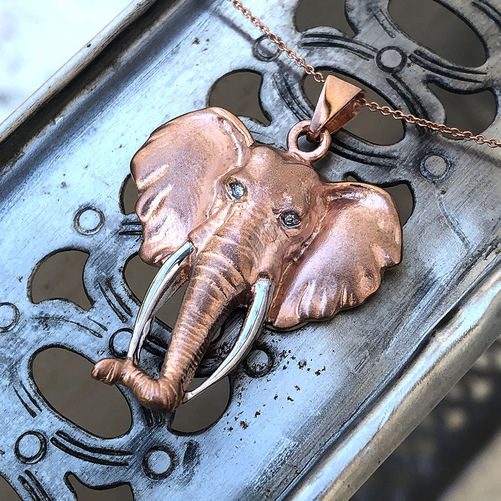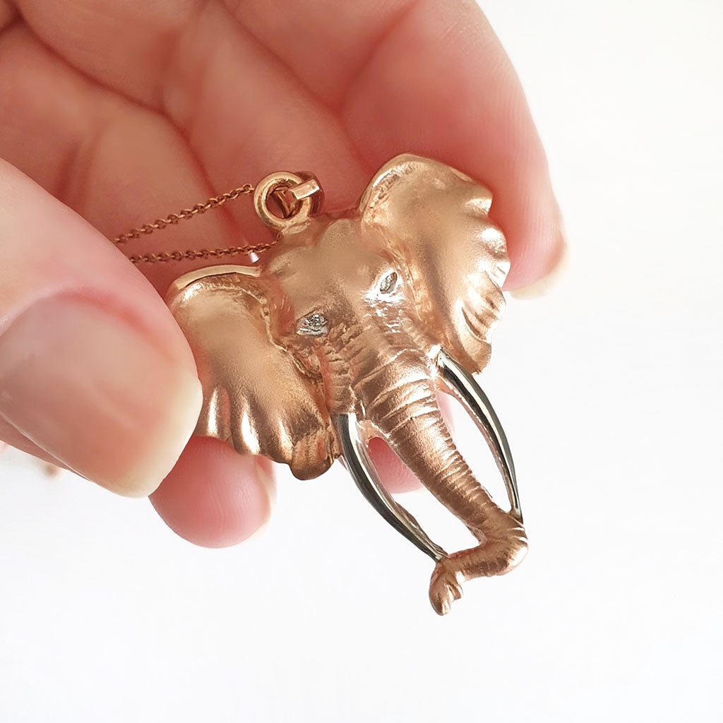The magnificent African elephant is celebrated in this exquisite two-tone gold pendant. The finely detailed elephant head is crafted in textured nine-carat rose gold, with gleaming white gold tusks and sparkling diamond eyes. It's a beautiful piece for wild souls who dance to the pulsing beat of Africa.