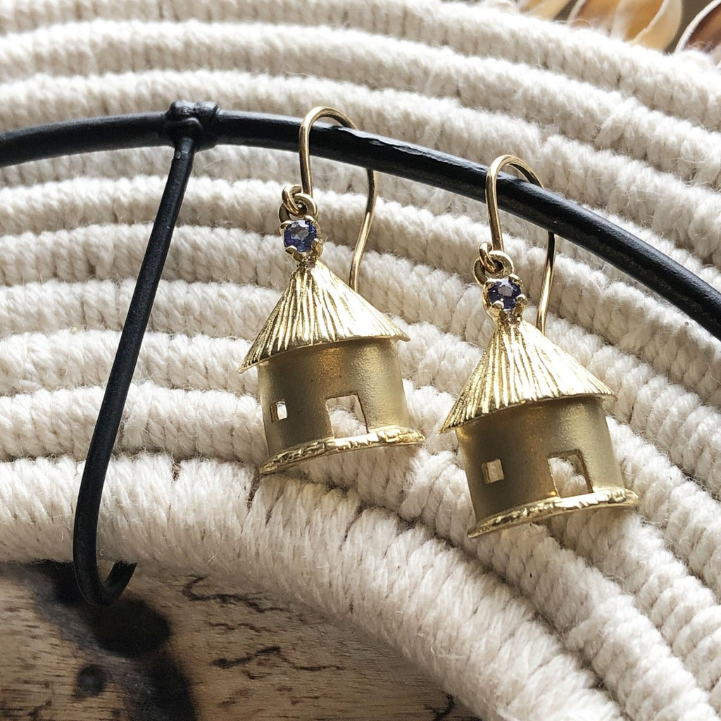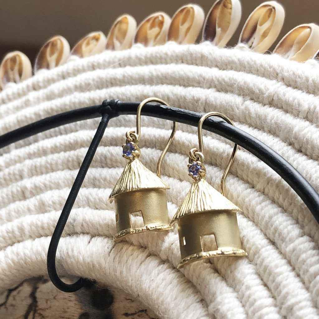 These playful fourteen-carat gold rondavel earrings celebrate the traditional homes of southern African people like the Xhosa of the Eastern Cape of South Africa. The earrings are crafted using several textural techniques and finished with tanzanite accents.