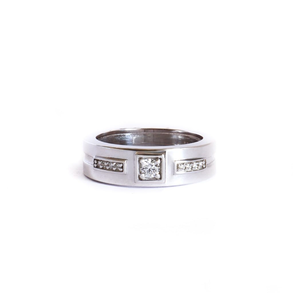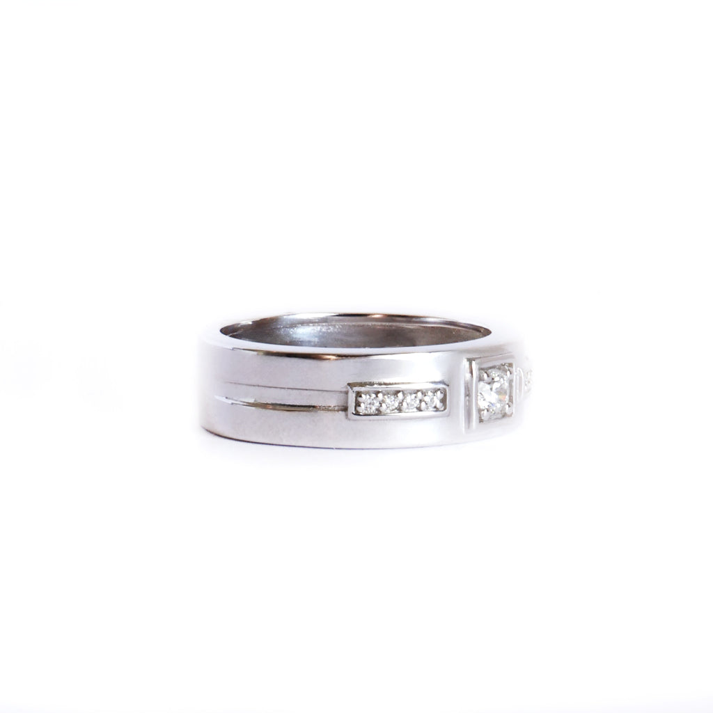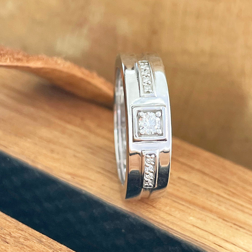 Bold and regal, this men's ring is a statement of power and elegance. A striking round-cut White Diamond takes centre stage, set within an elevated square detail at the apex of a wide, nine-carat White gold band. The fieryness of the central white diamond is perfectly complemented by pavé-set white diamonds embedded in raised rectangular accents, adding a touch of brilliance to the design.