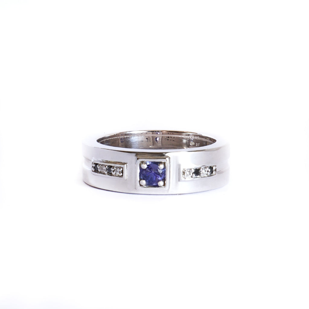 Bold and regal, this men's ring is a statement of power and elegance. A striking round-cut tanzanite takes centre stage, set within an elevated square detail at the apex of a wide, nine-carat white gold band. The vibrant blue of the tanzanite is perfectly complemented by alternating pavé-set white and black diamonds embedded in raised rectangular accents, adding a touch of brilliance to the design.