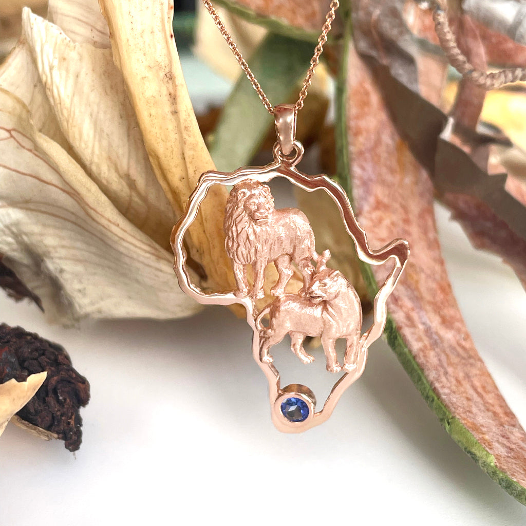 Masculine and feminine, pride and power are represented by an African lion and lioness at the core of this striking pendant. The couple stand alert and powerful within a fluid rose gold outline of the continent. The pendant is accented with an exquisite bezel-set tanzanite, adding a touch of brilliance and allure.
