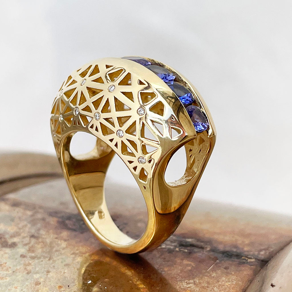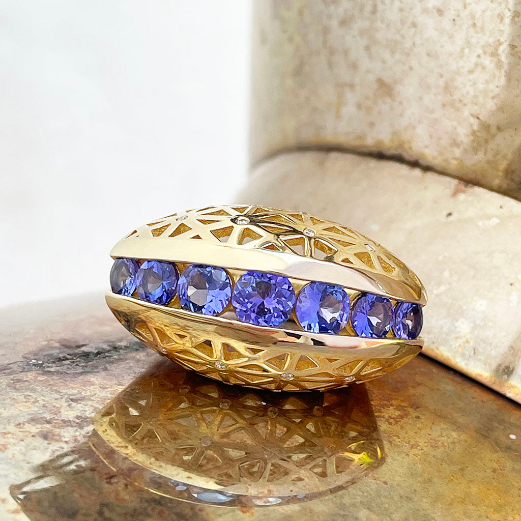 Daring tanzanite and yellow gold signature ring, for the jewellery lover who insists on making a statement. The detailing on this unique ring is exceptional, featuring filigree accented with diamonds . The listed price is for the yellow gold as it is currently available, but this unusual piece can be recreated in the yellow gold.