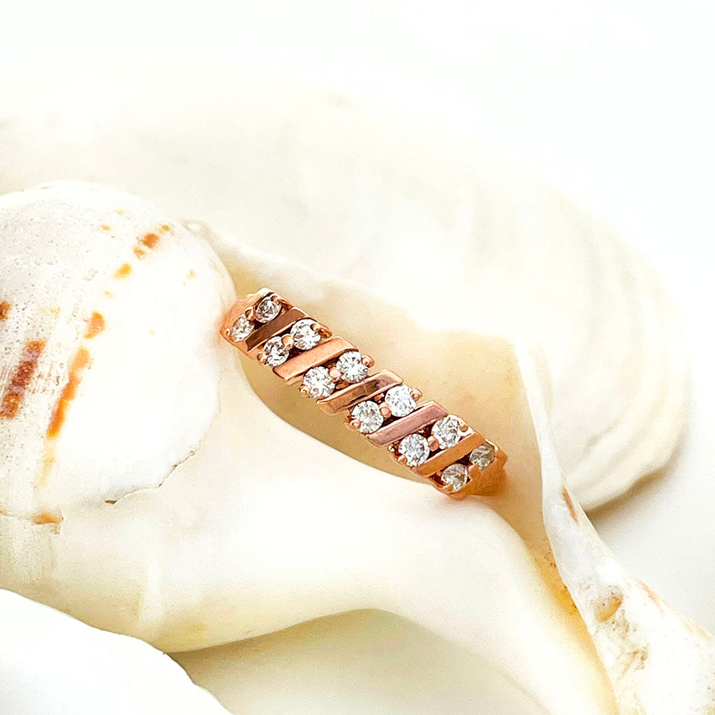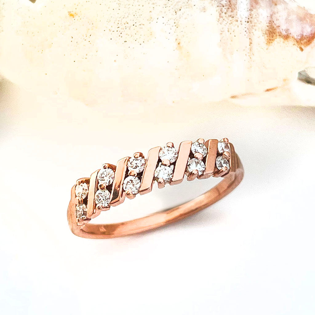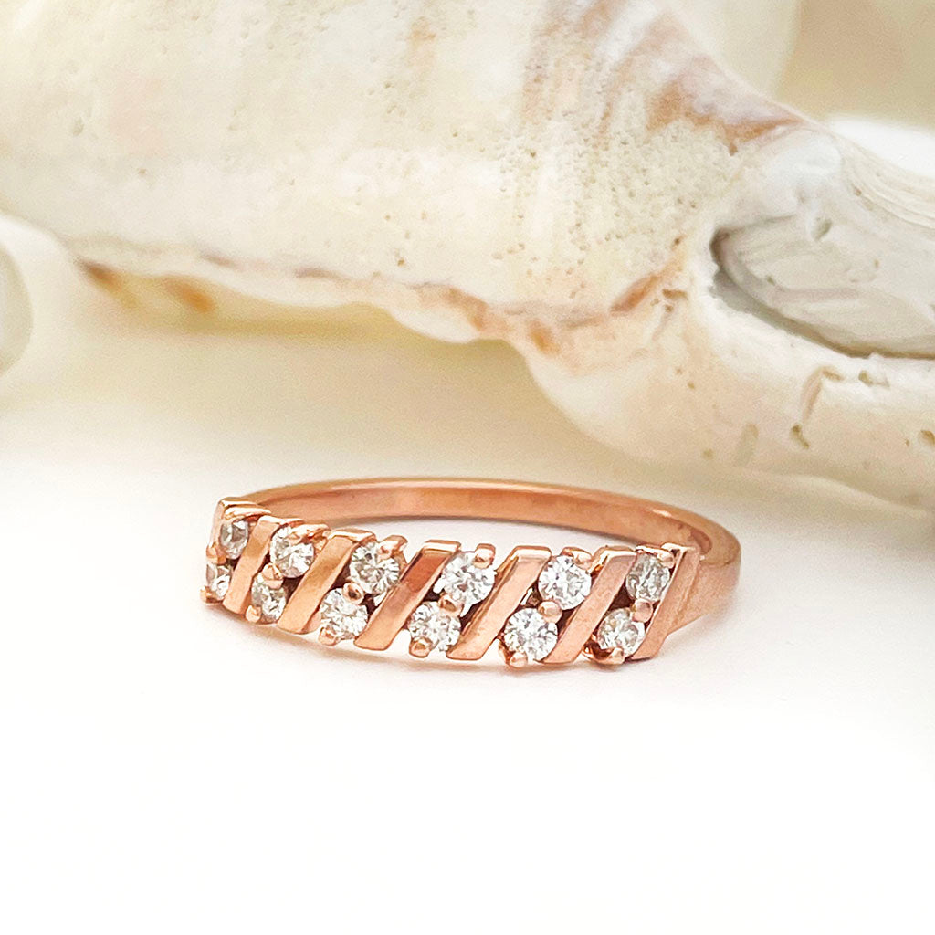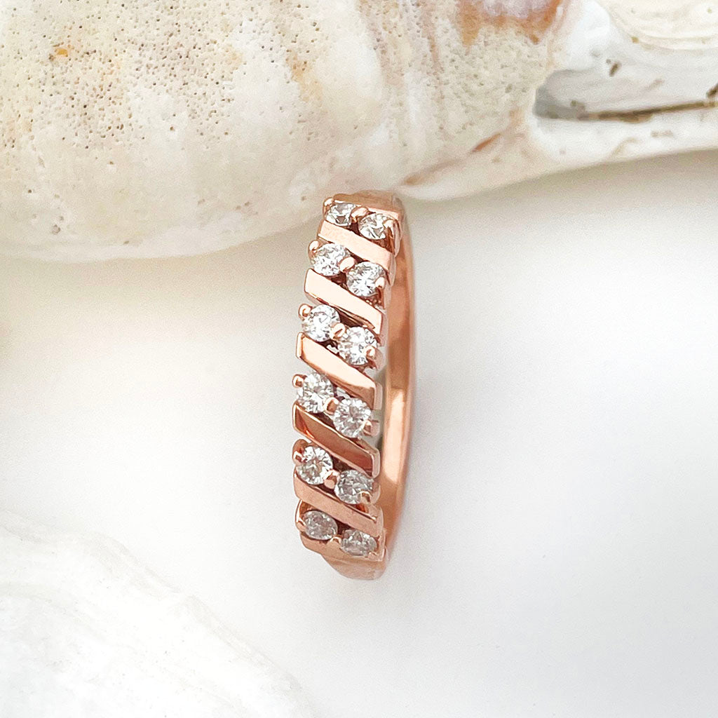 This unique showstopping ring design features diagonal alternating nine-carat rose gold bars separated by diamond pairs. A distinctive wedding band to complement any contemporary engagement ring.