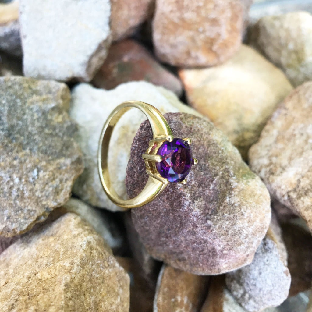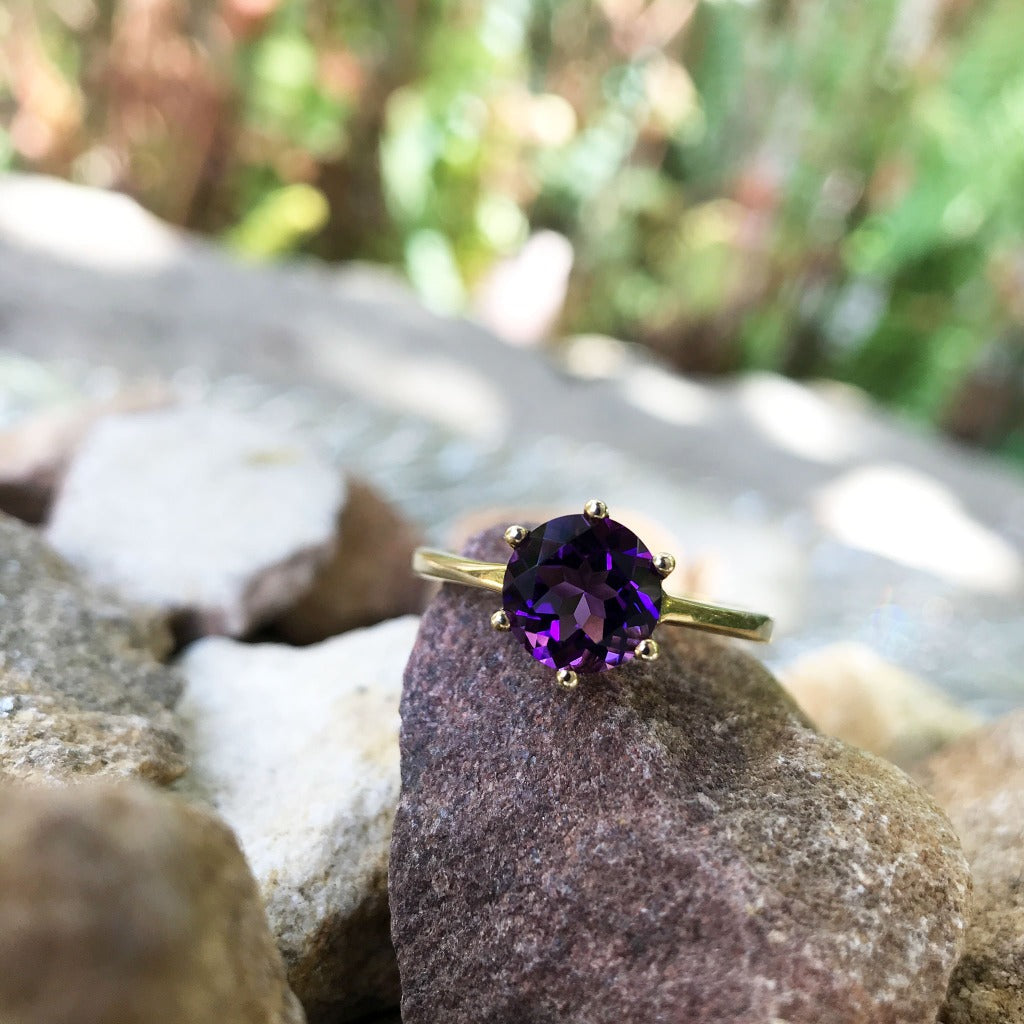 Round Cut Amethyst and Yellow Gold Six Claw Ring