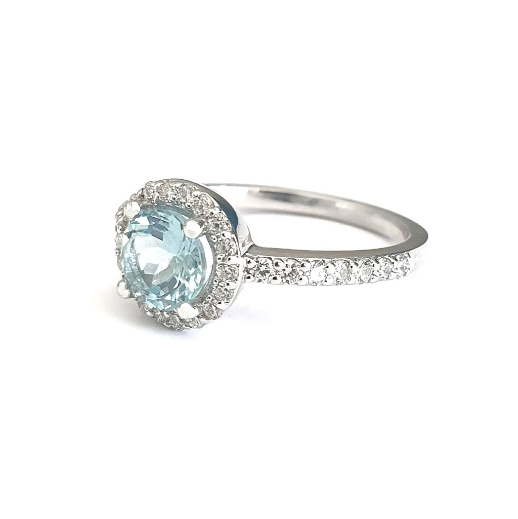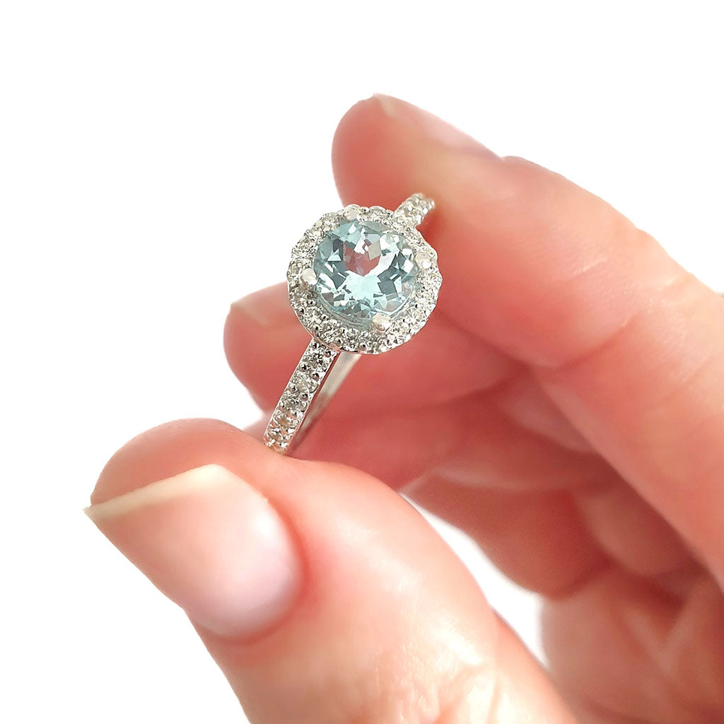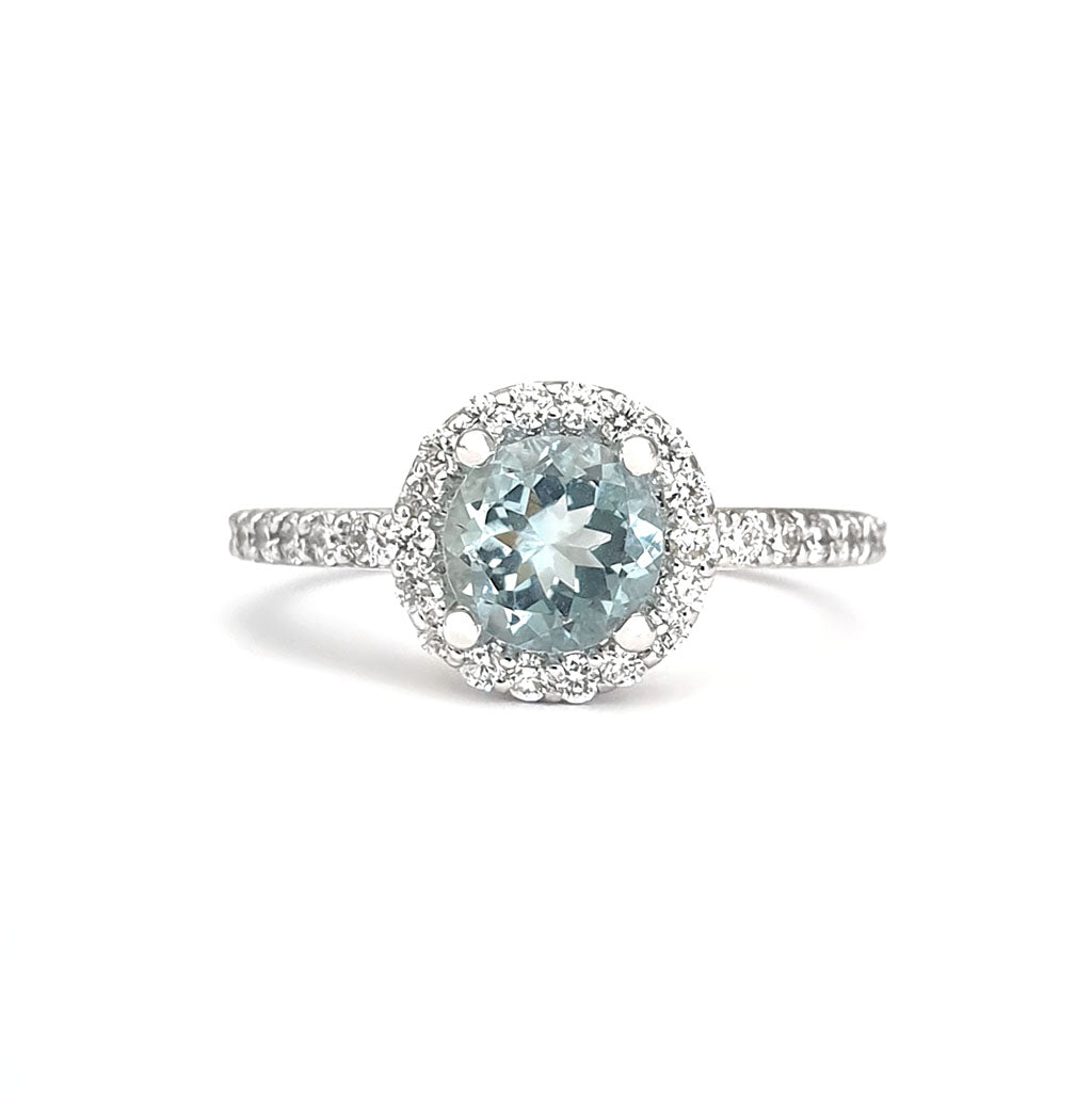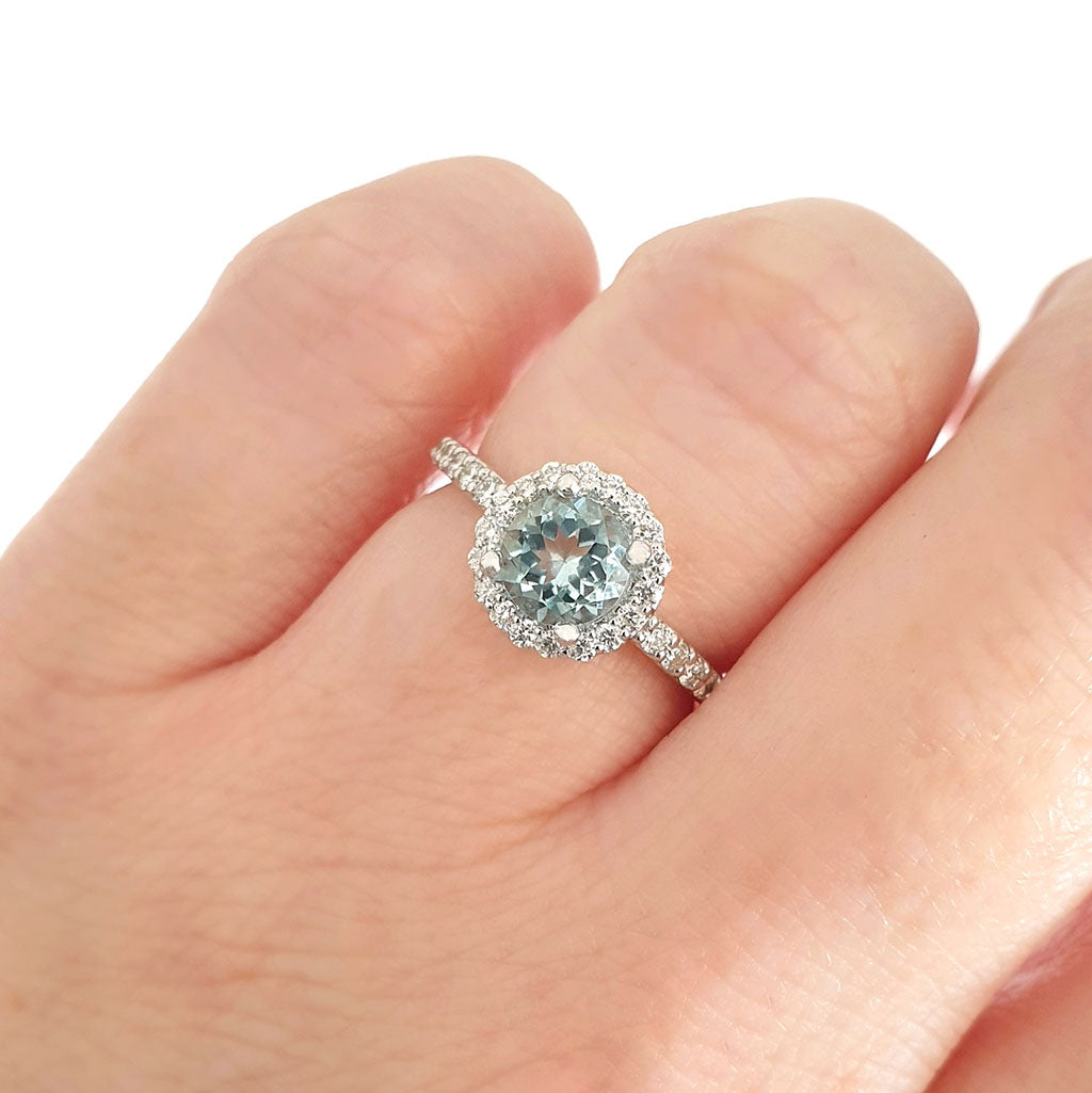 Aquamarine Round Cut Ring with Halo Diamond Accent
