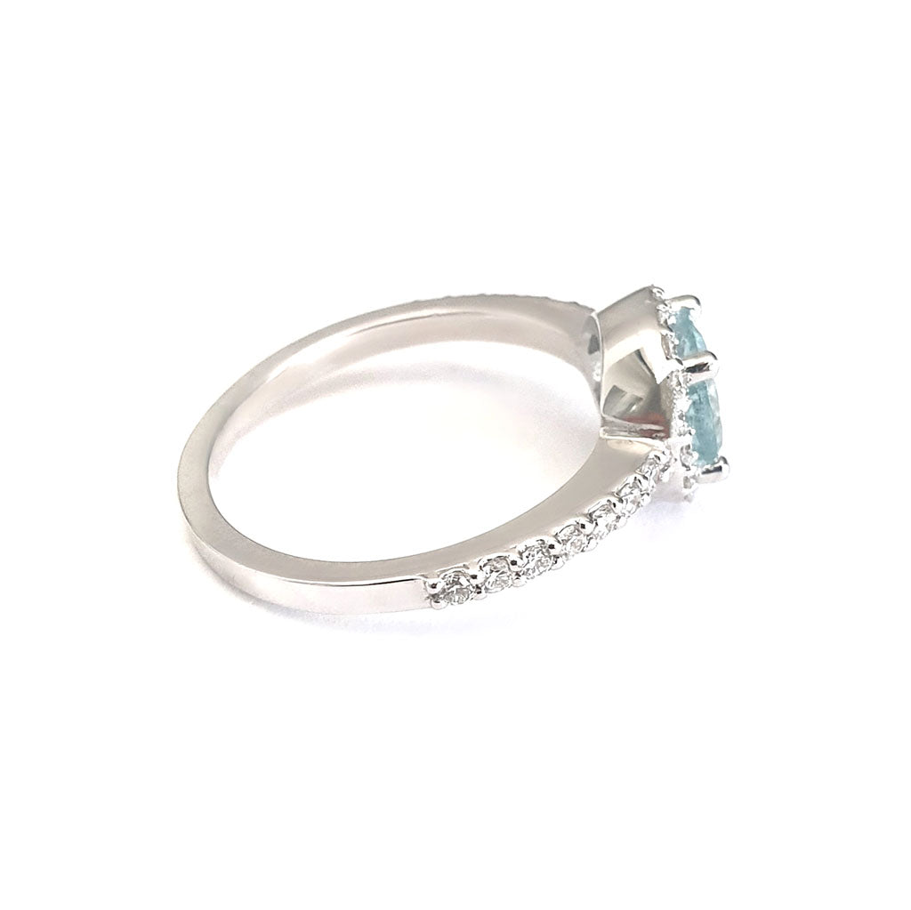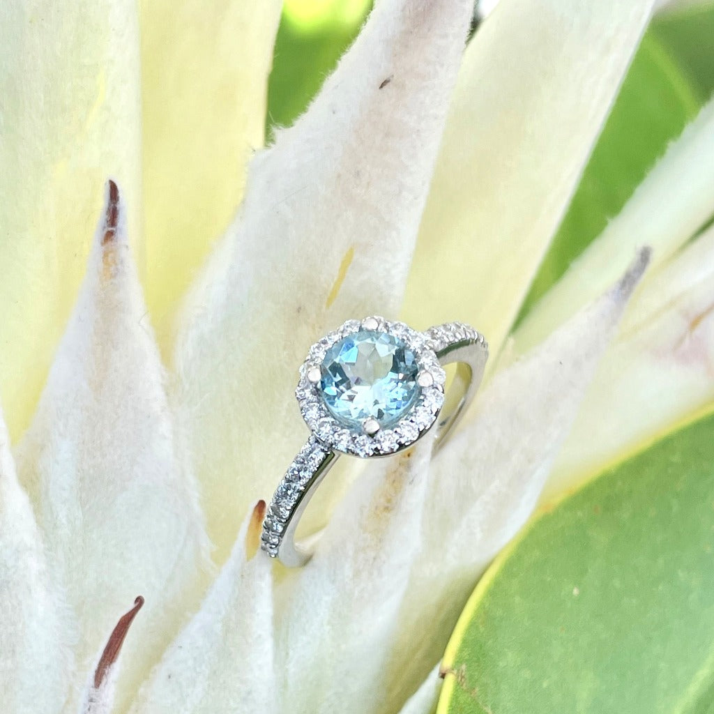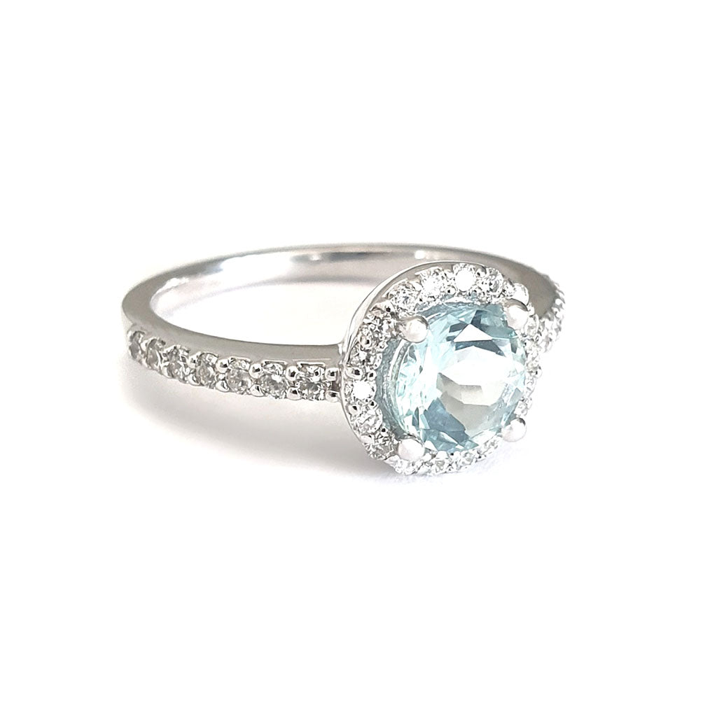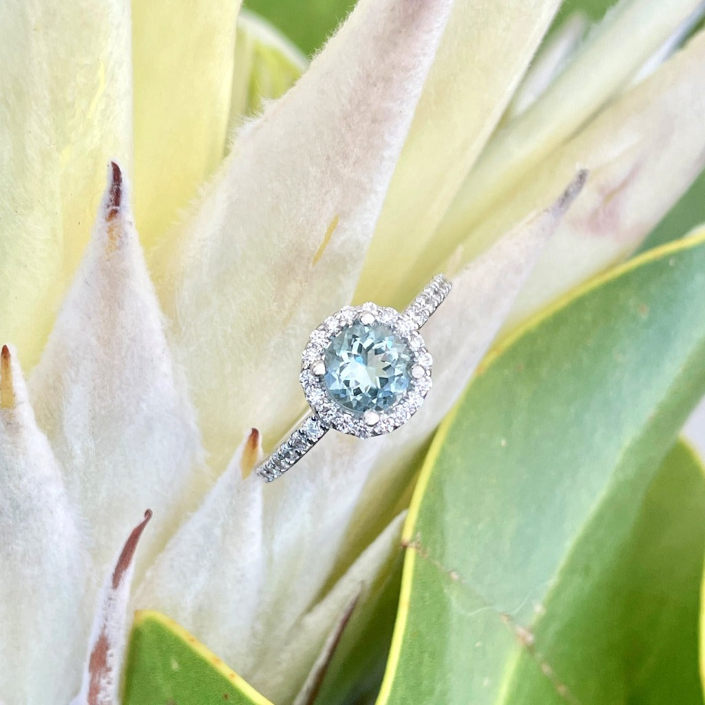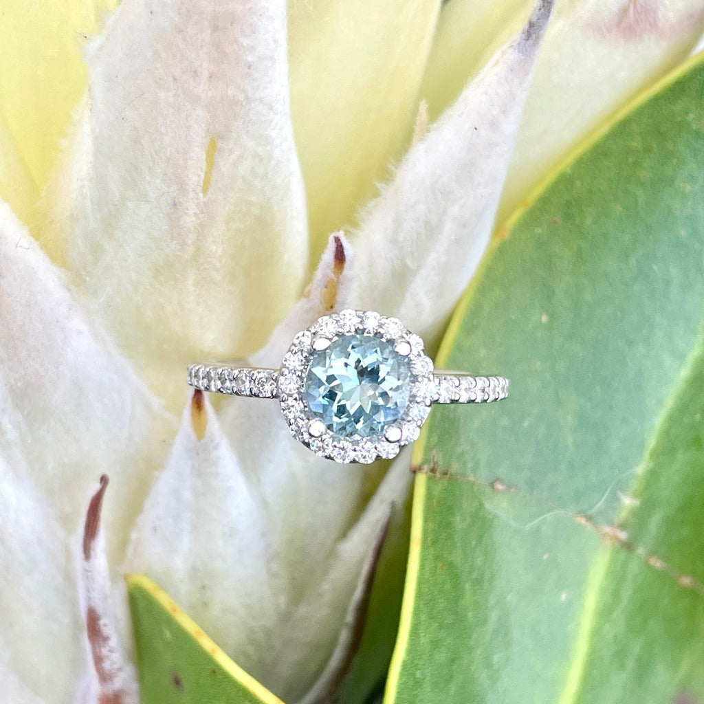 Aquamarine Round Cut Ring with Halo Diamond Accent