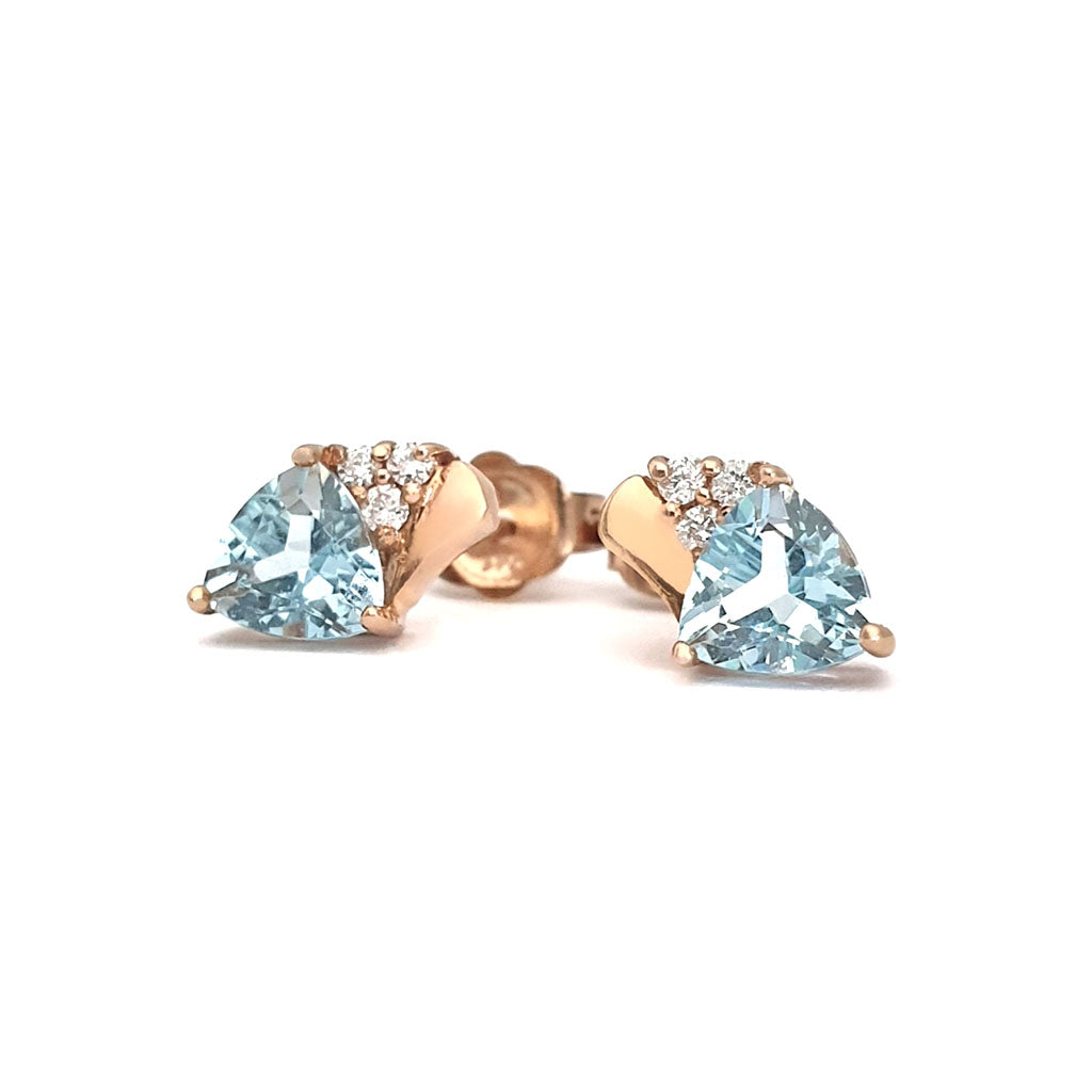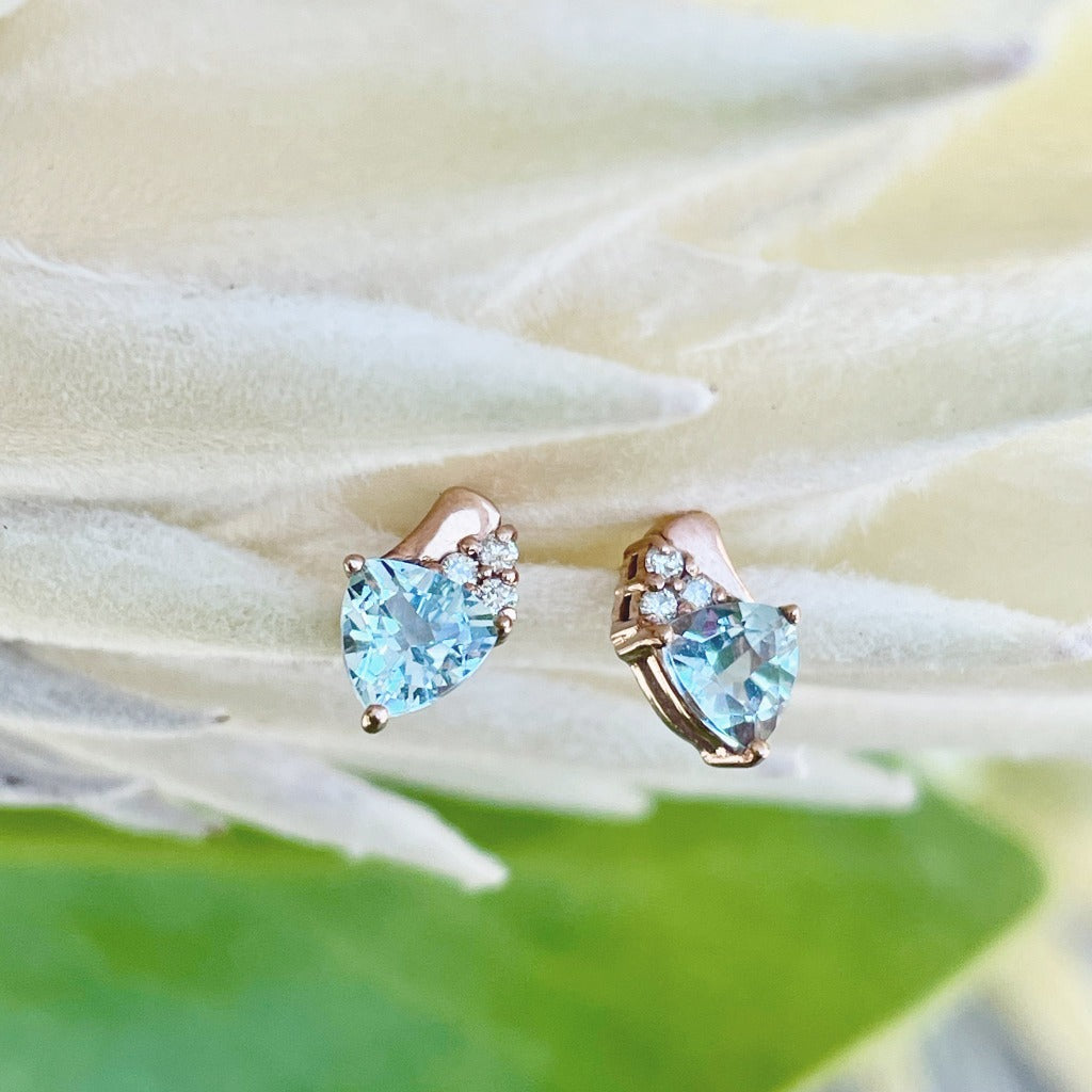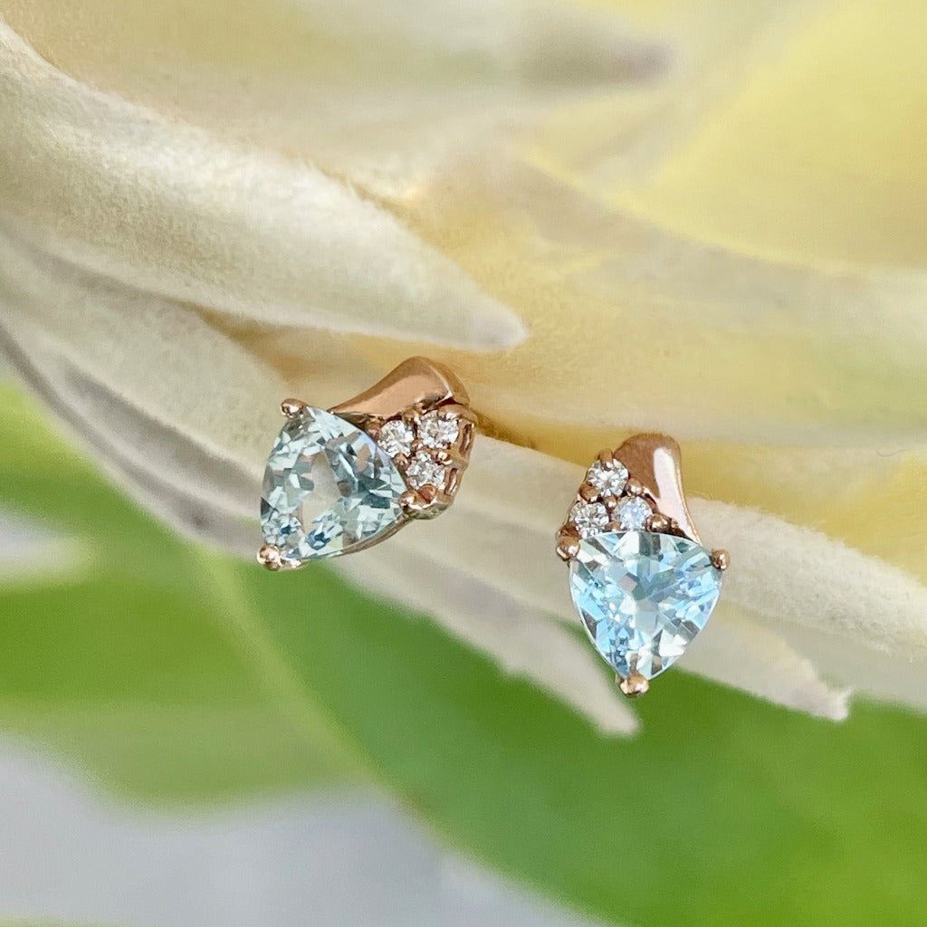 Trilliant Aquamarine Rose Gold Studs with Accent Diamonds