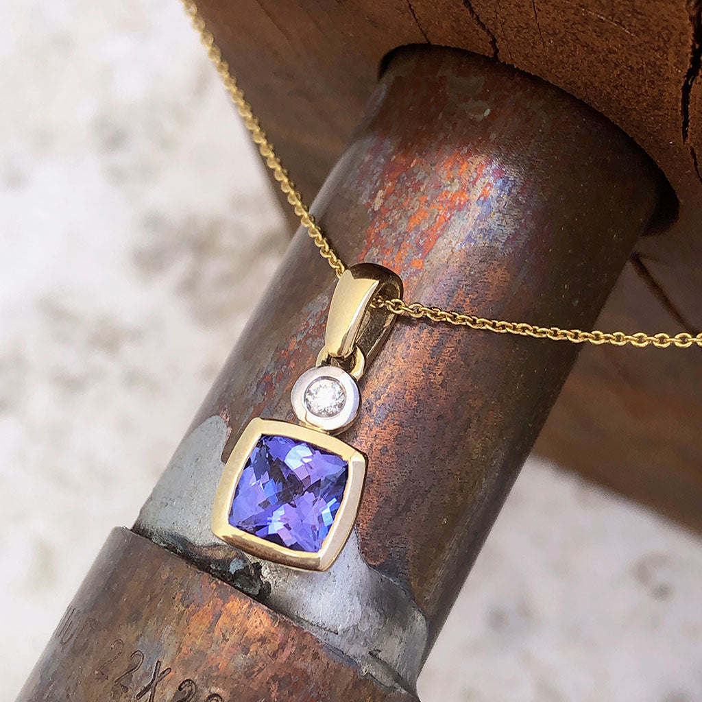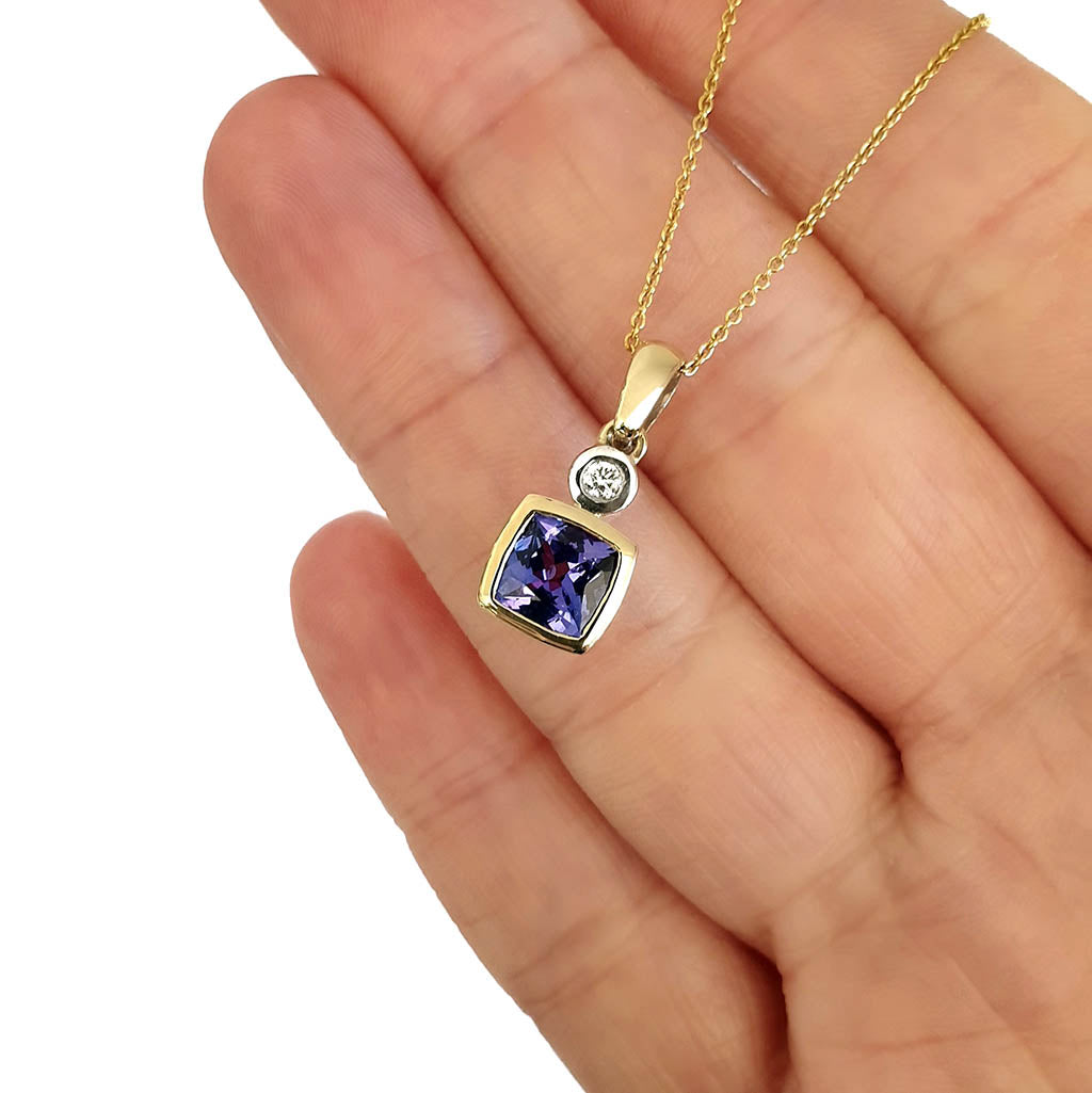 Bezel Set Cushion Cut Tanzanite and Diamond Yellow Gold Pendant