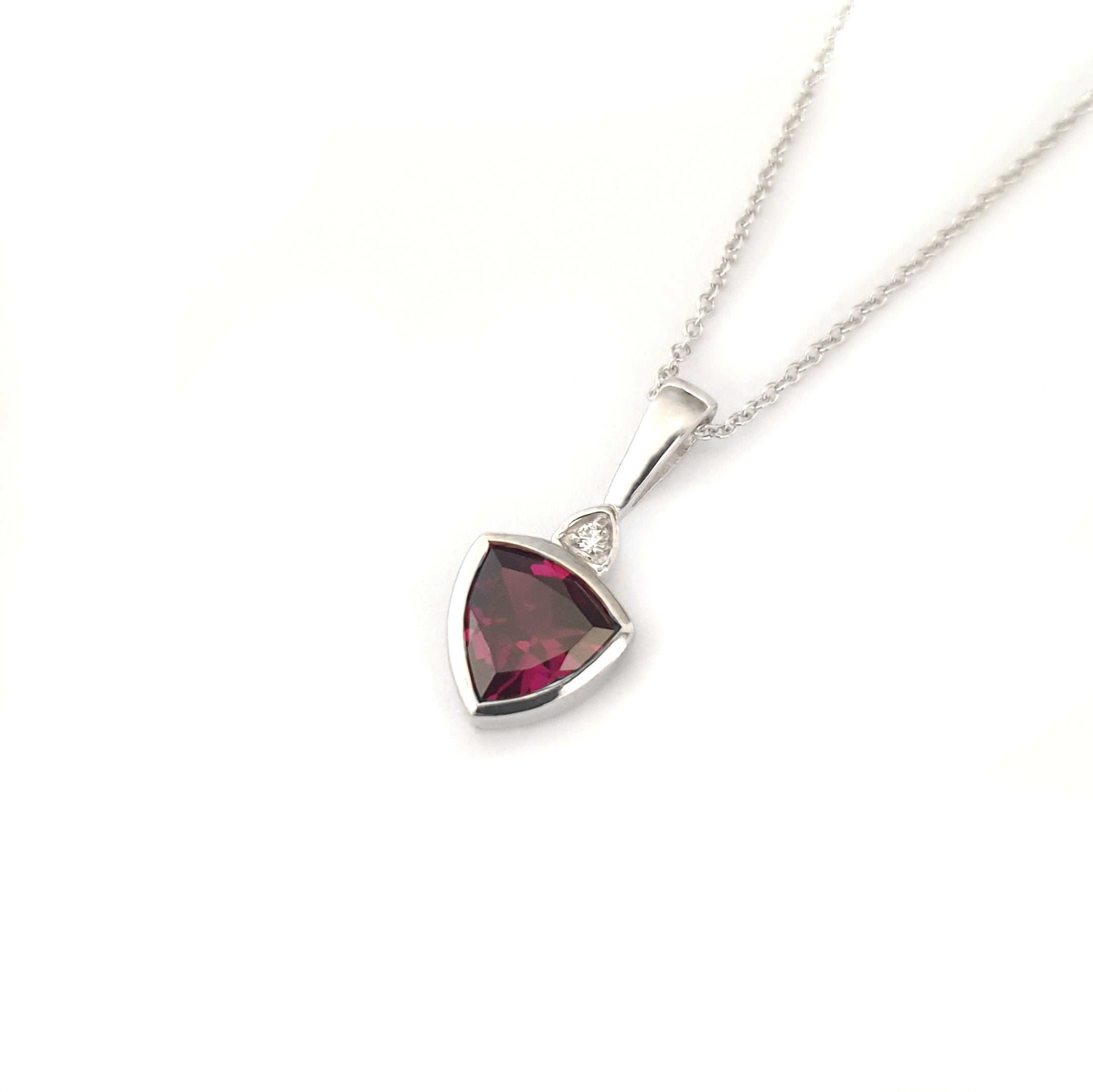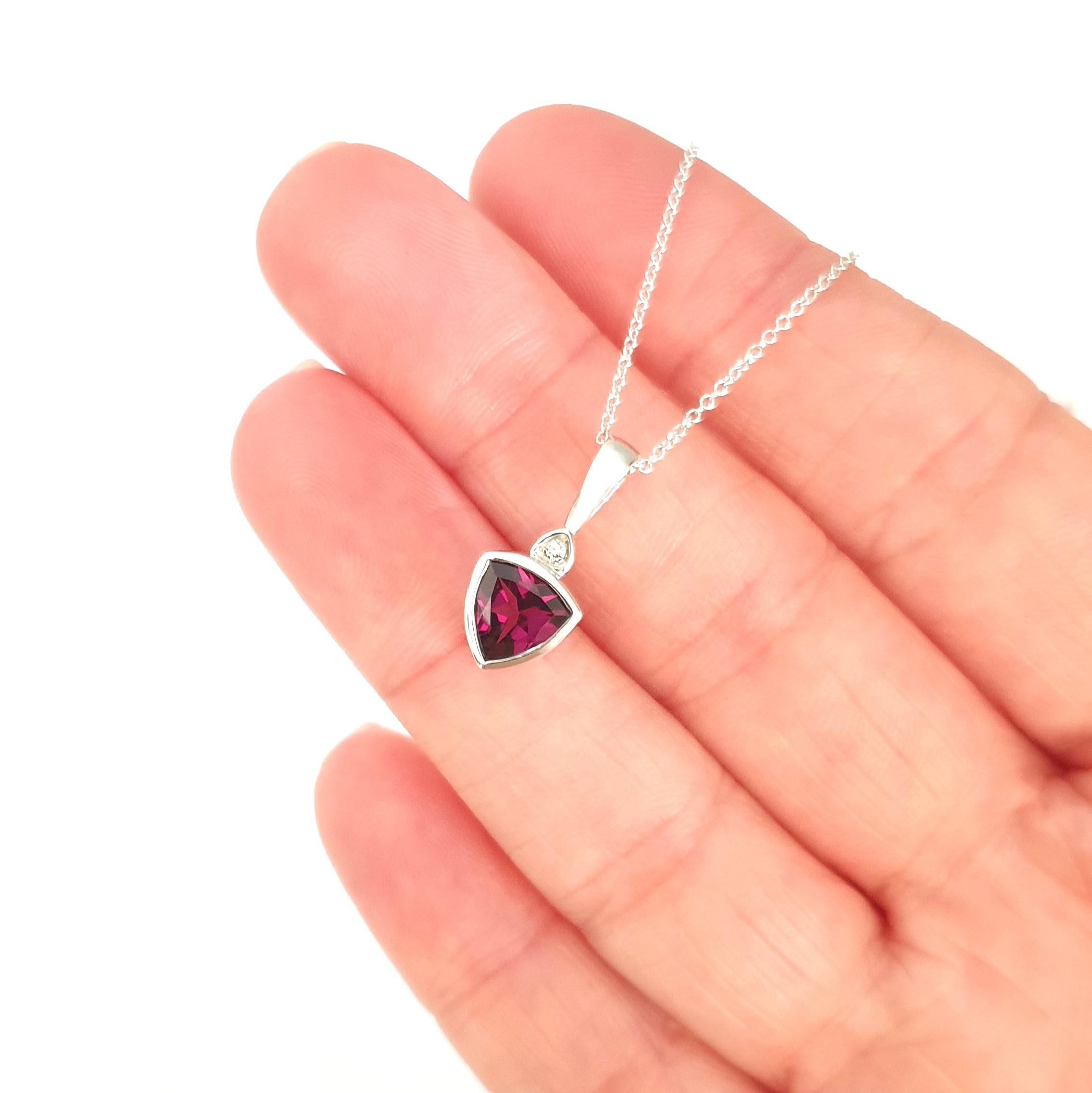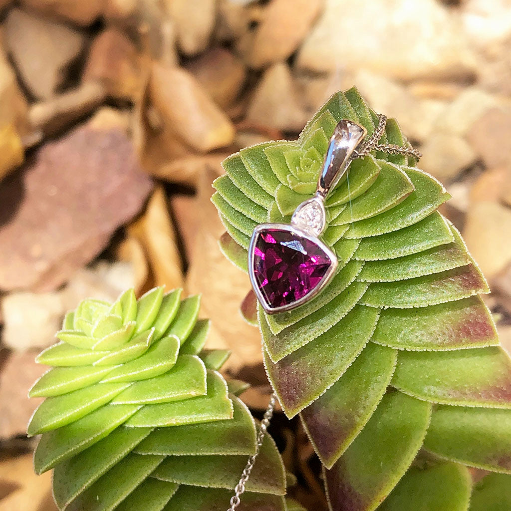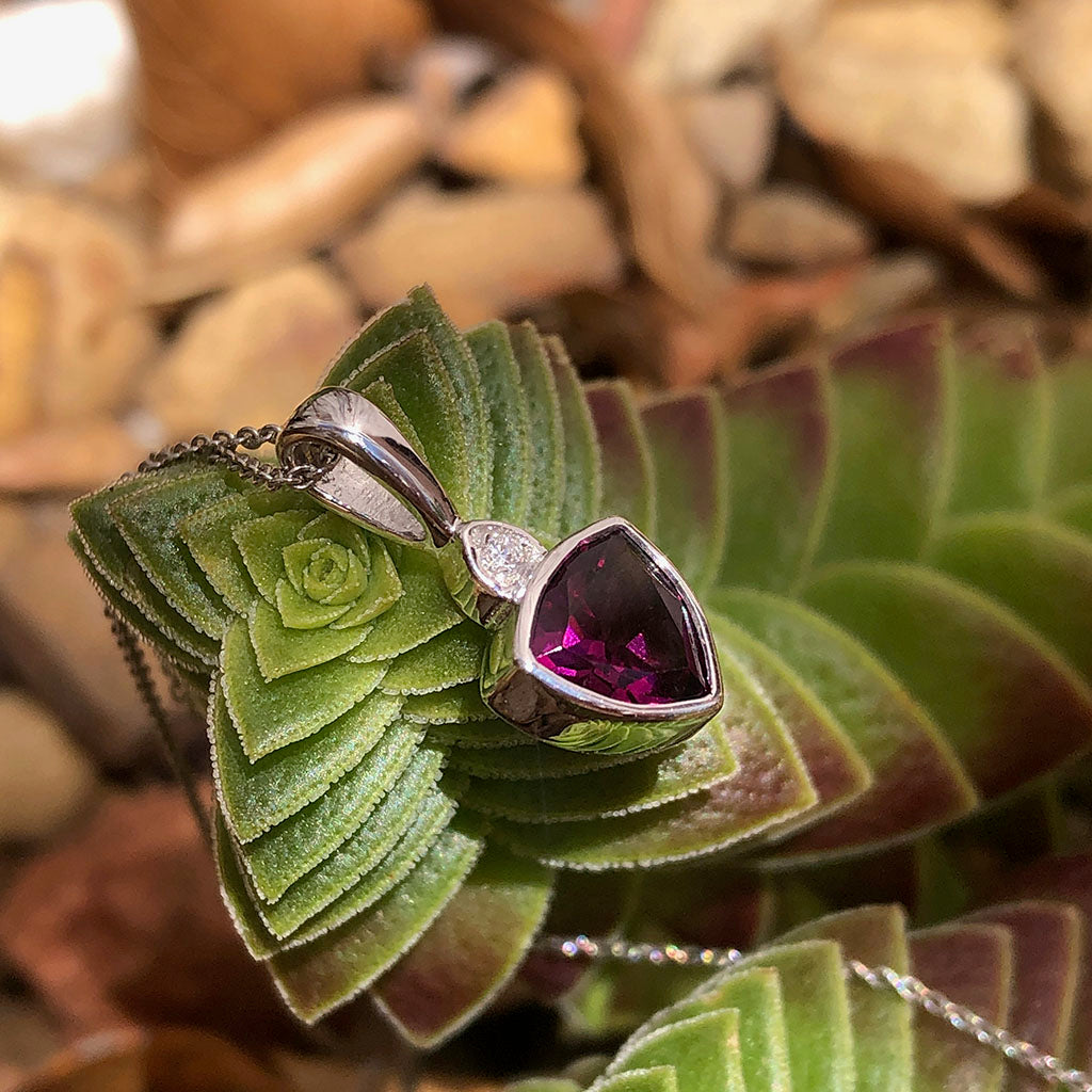 Bezel Set Trilliant Cut Grape Garnet and Diamond Pendant