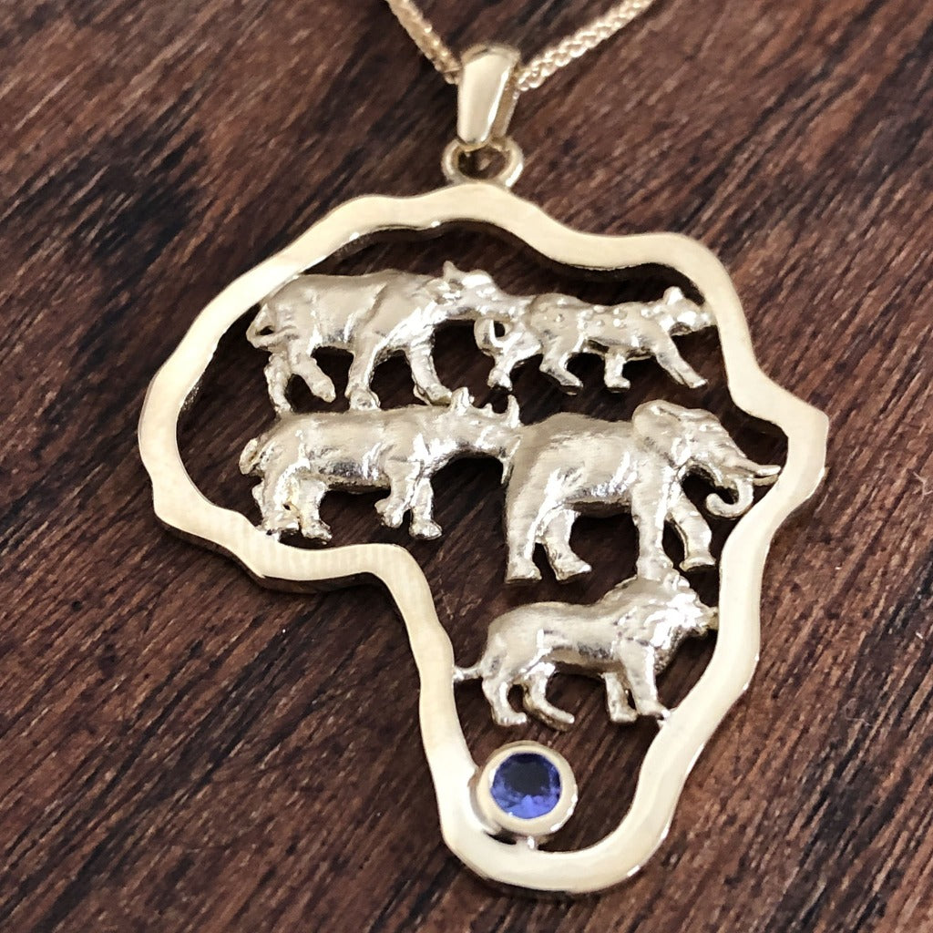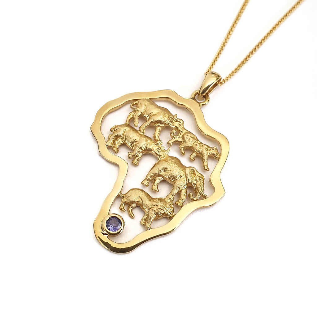 Radiate the wild soul of our amazing continent with a gold Big 5 pendant. The pendant features each of the Big 5 exquisitely crafted inside the African continent. The entire piece is cast in nine-carat yellow gold. A tanzanite adds the final African touch to the piece.
