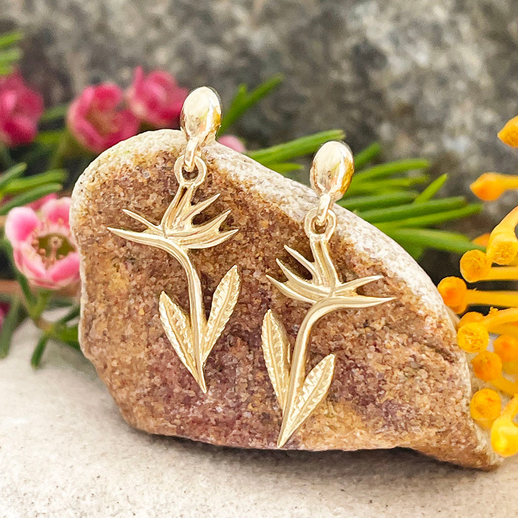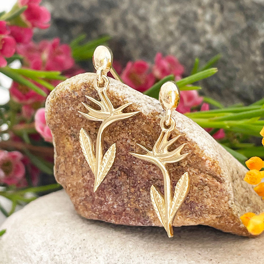 A true piece of wearable art, our Bird of Paradise earrings bring a golden glow to every movement.