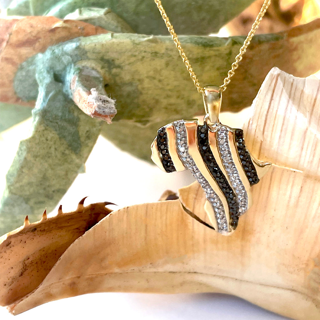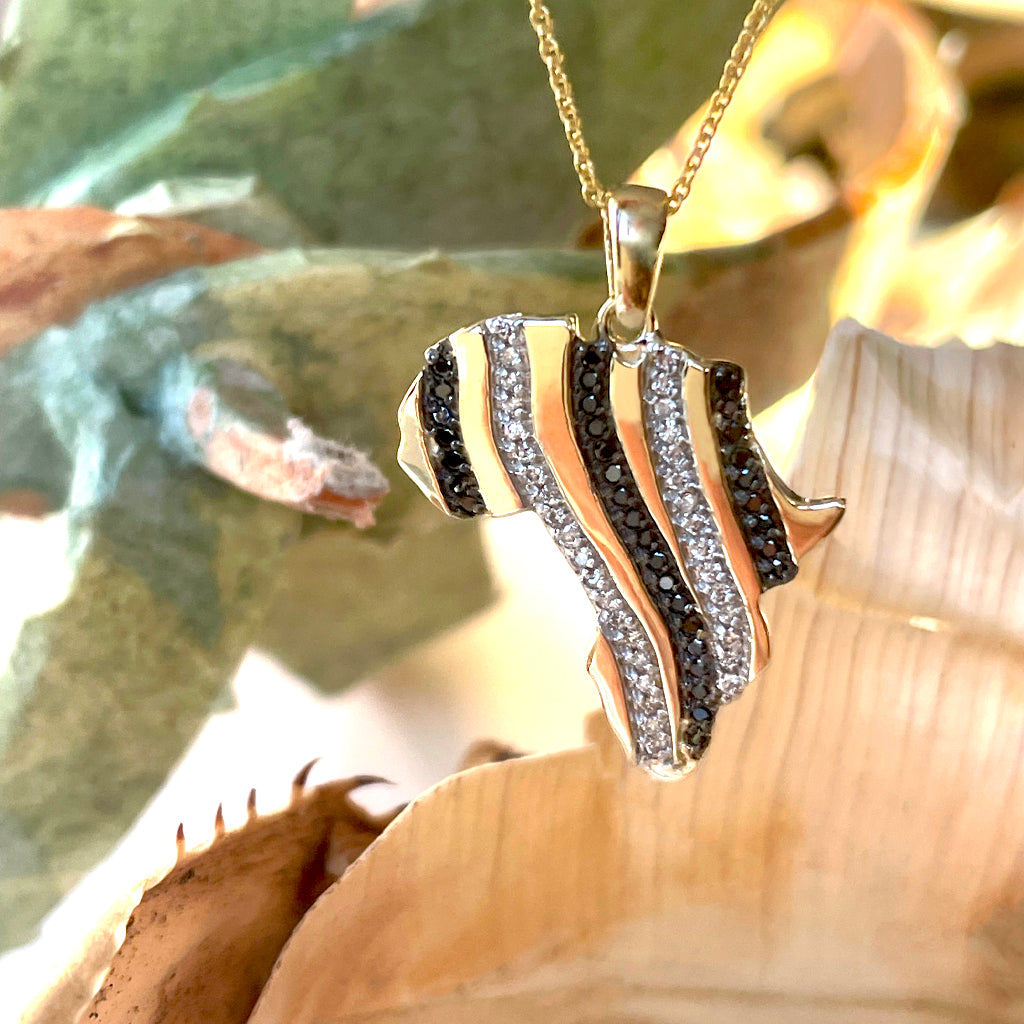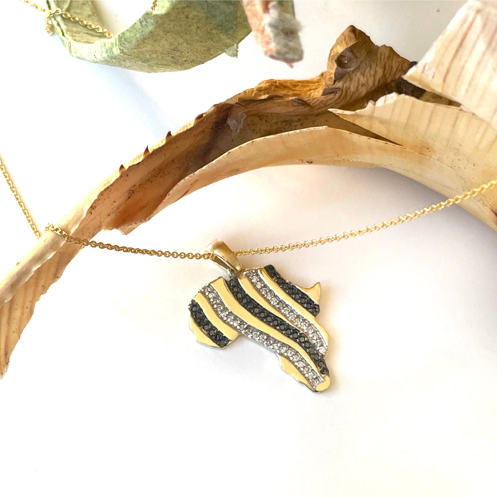 Black and White Diamond Zebra Striped Africa Map Yellow Gold Pendant