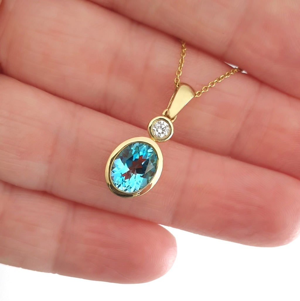 The intensity of the oval cut blue topaz is brought vividly to life by the yellow gold setting of this stately pendant. A white diamond brings a fiery accent to the pendant. Both gemstones are bezel set, further enhancing the blue depths of the topaz. The piece is suspended on a 9 carat yellow gold anchor chain.