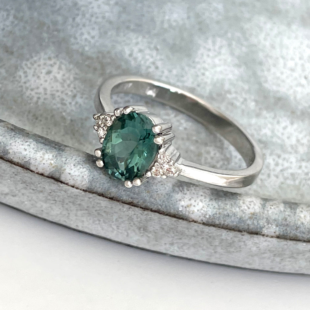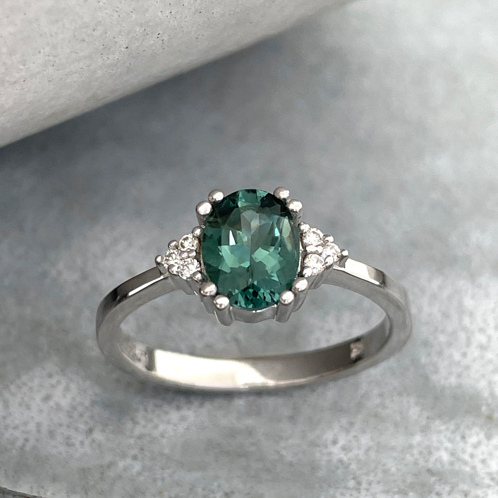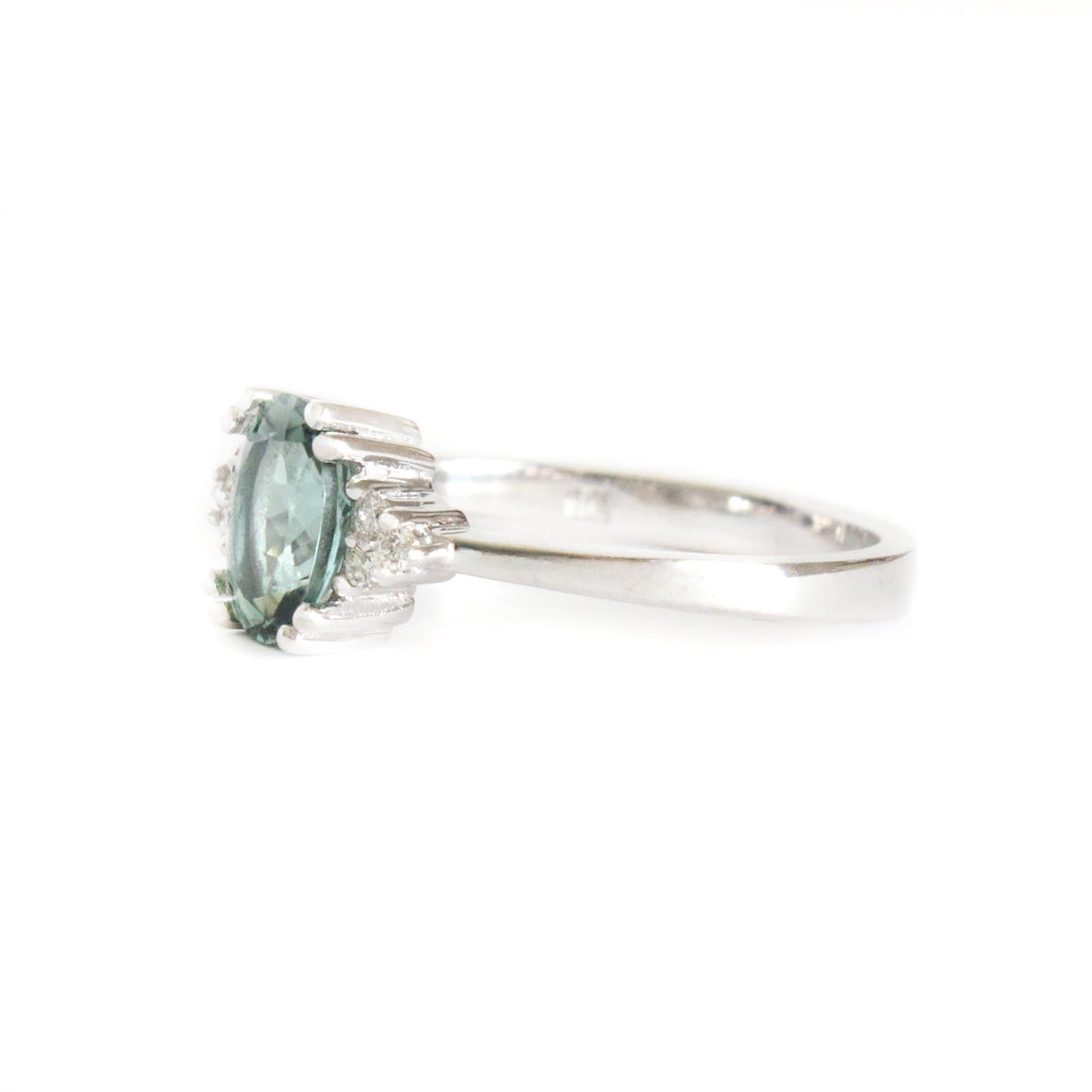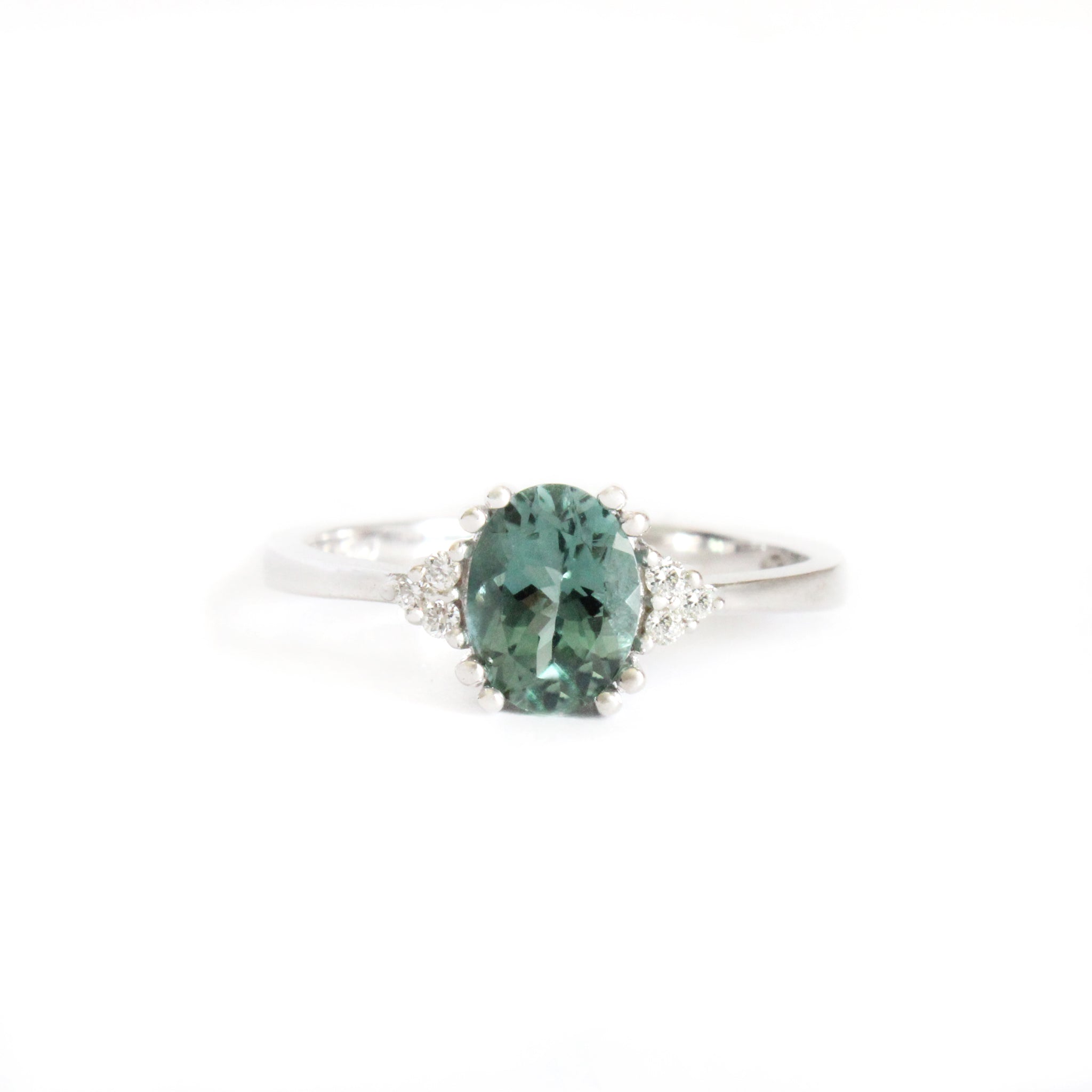 Breathtaking Oval Cut Sea Green Tourmaline With Trilogy Diamond Shoulder Highlight Ring