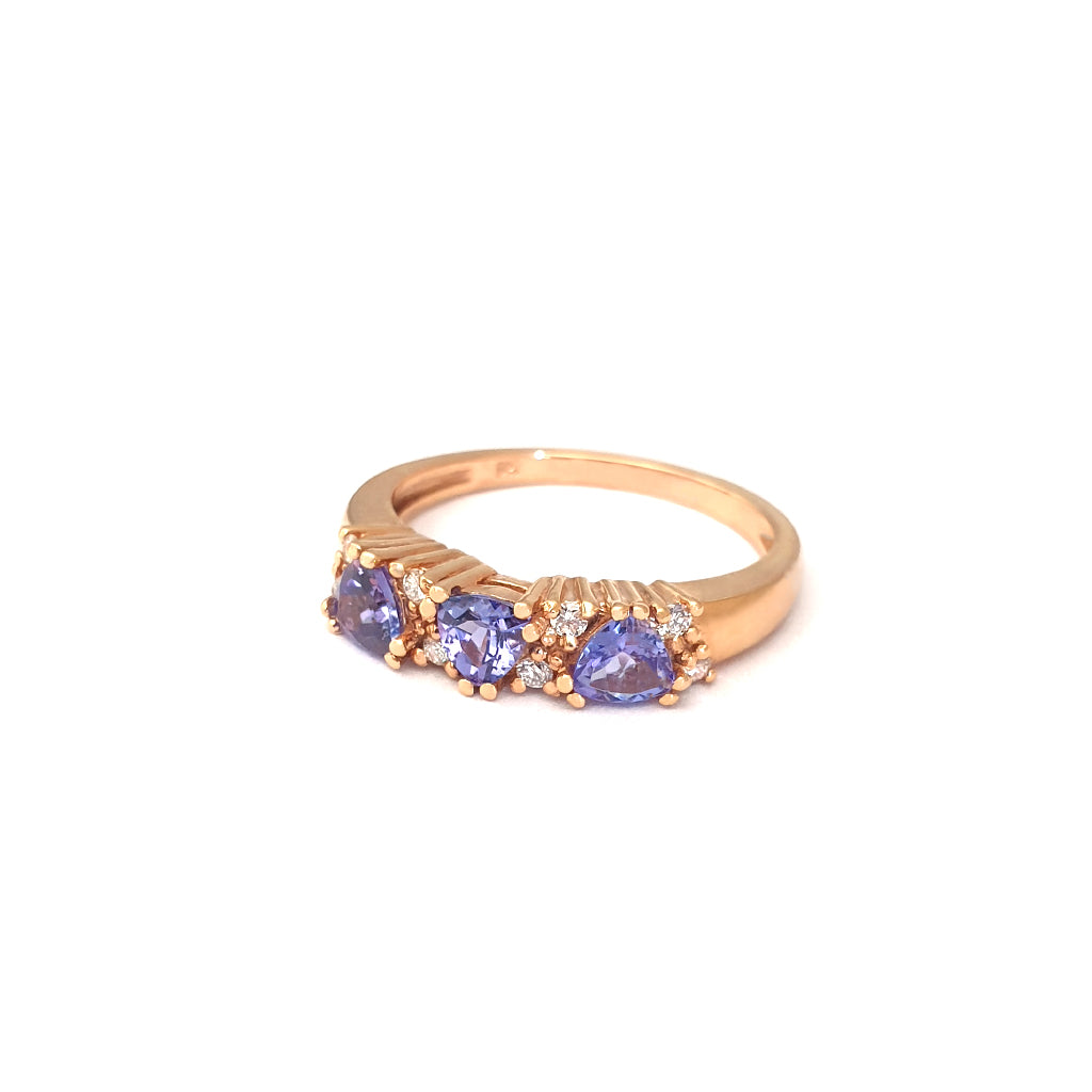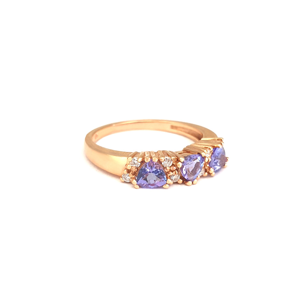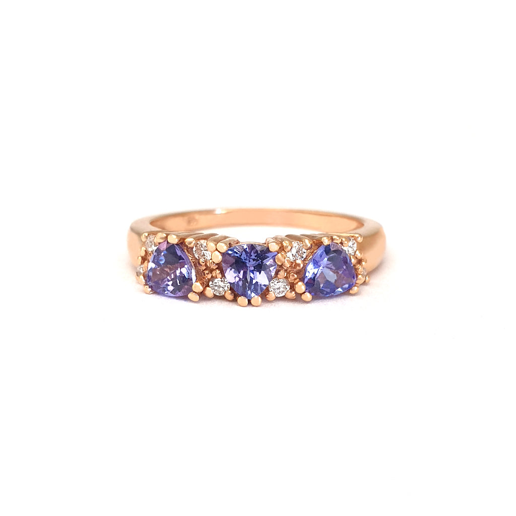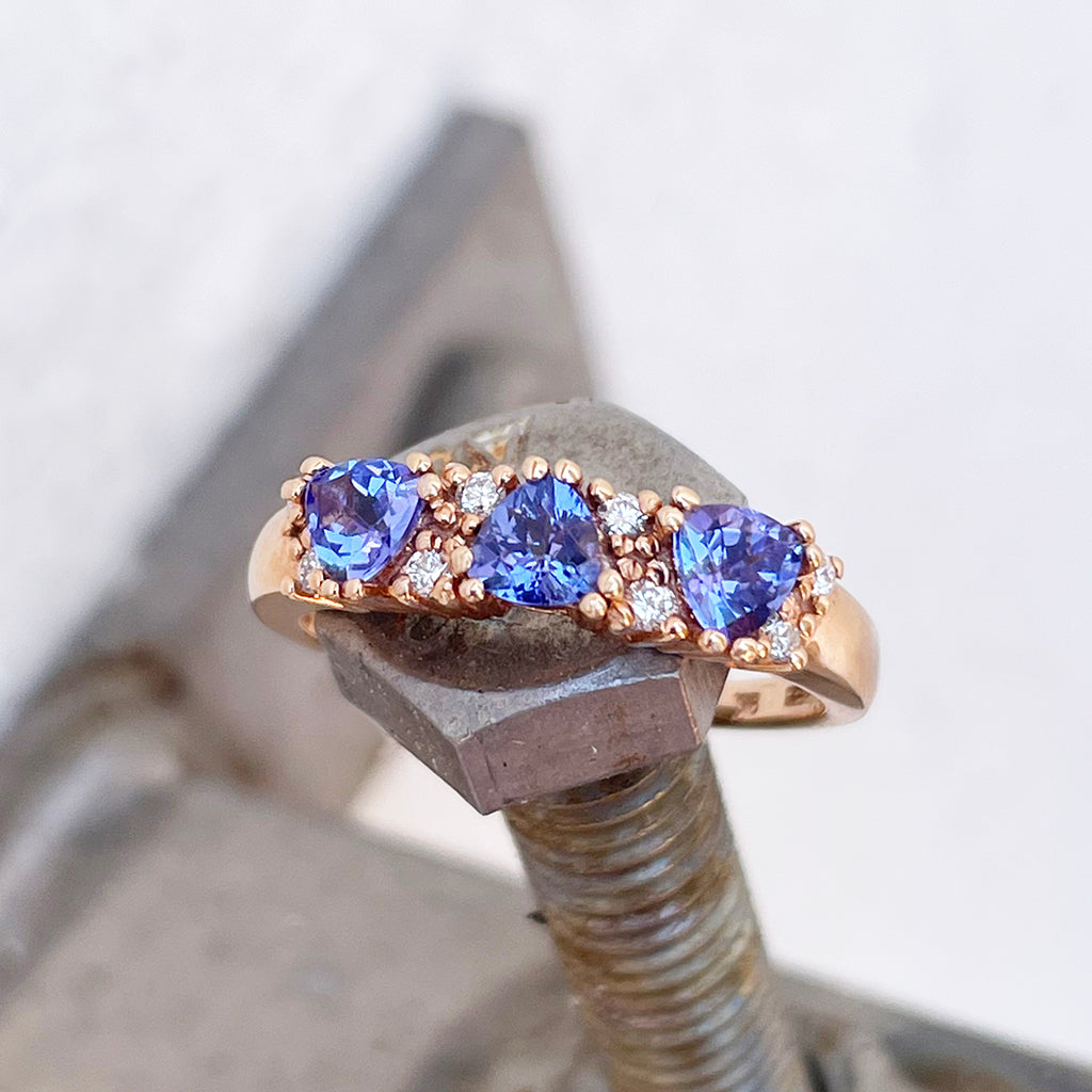 Breathtaking Three Trilliant Cut Tanzanite and Diamond Rose Gold Ring