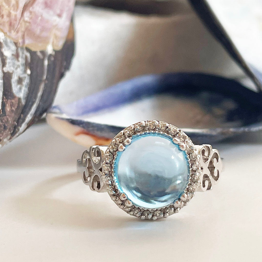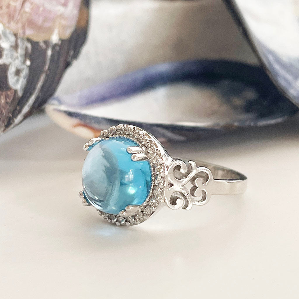 Cabochon Oval Cut Blue Topaz Three Band Shoulder White Gold Ring