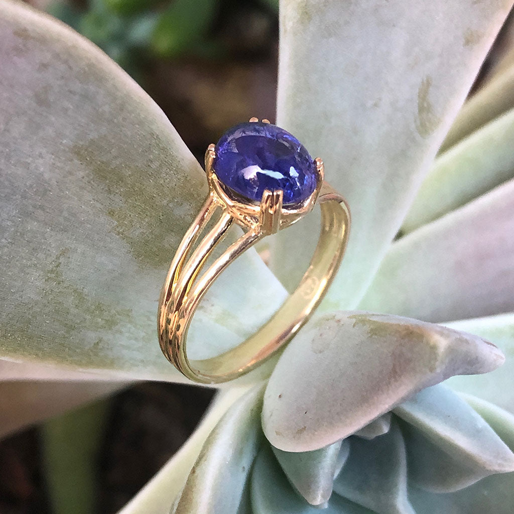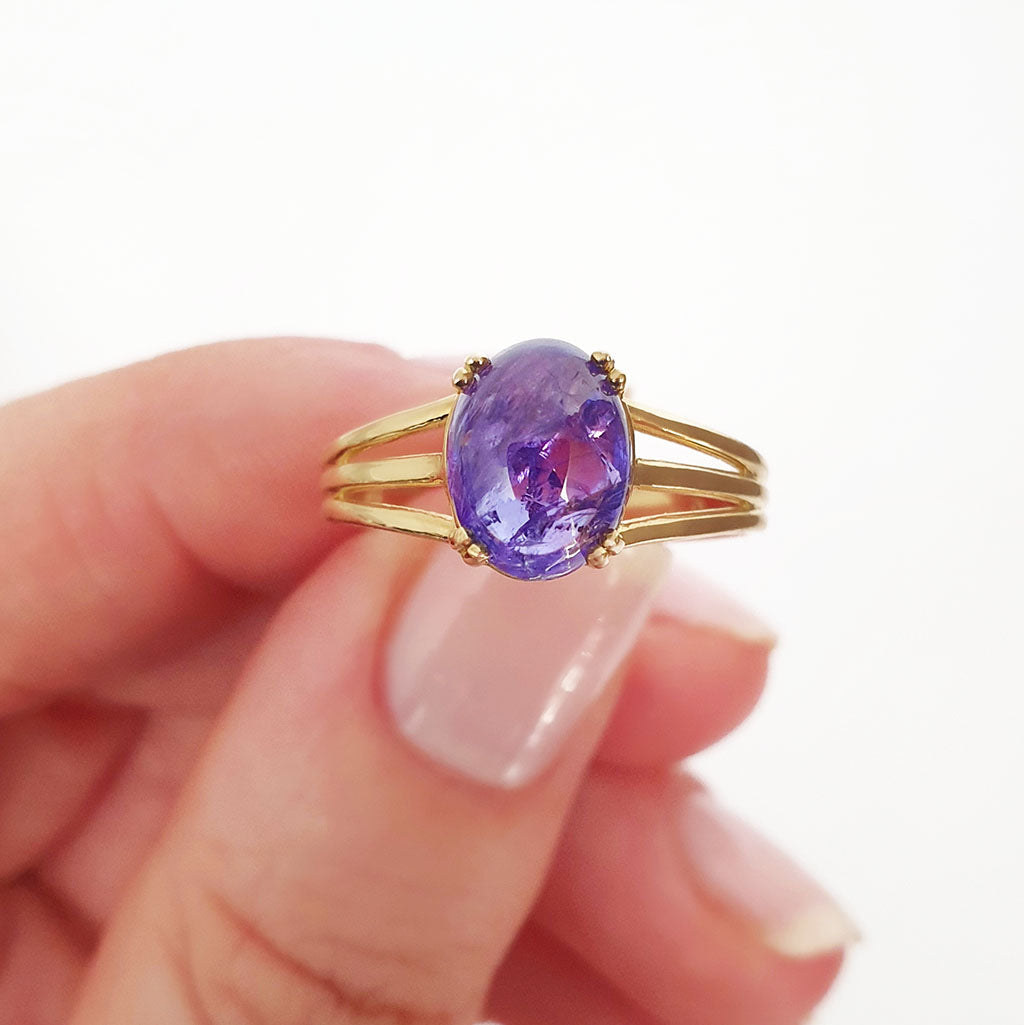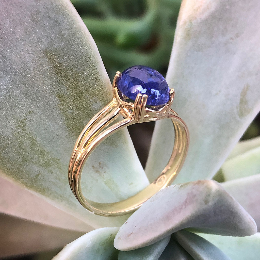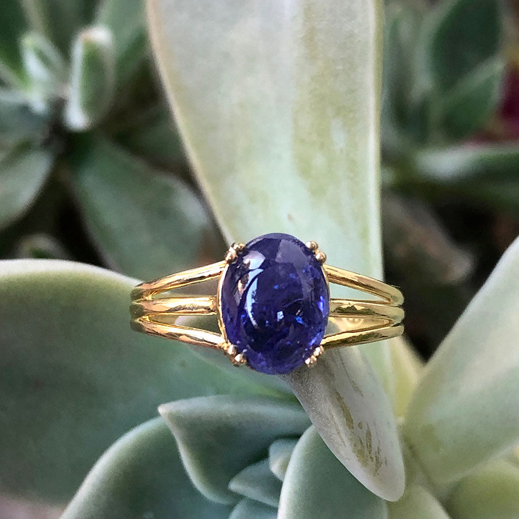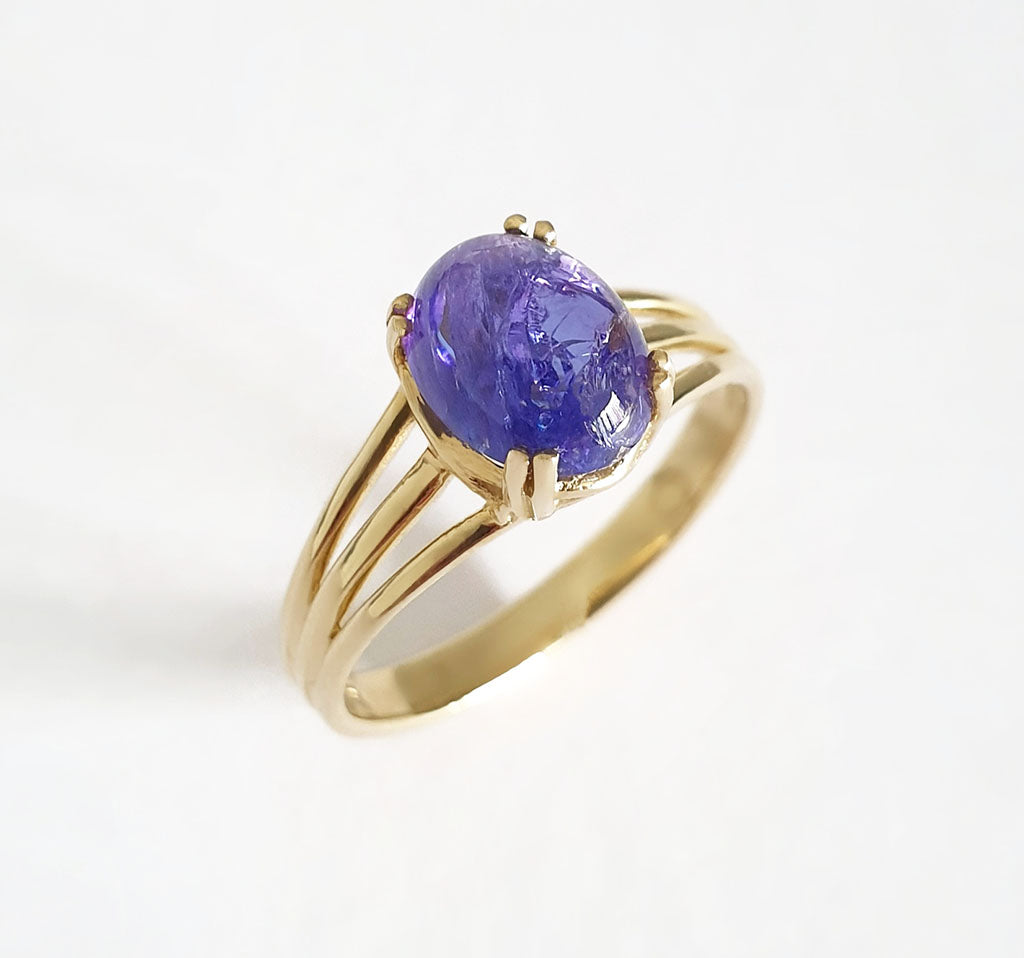 Cabochon Oval Cut Tanzanite Three Band Shoulder Yellow Gold Ring