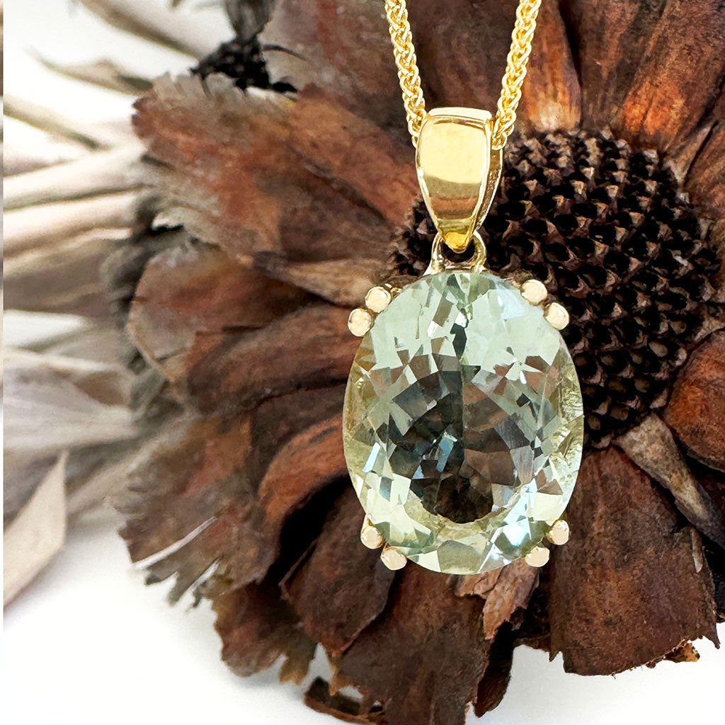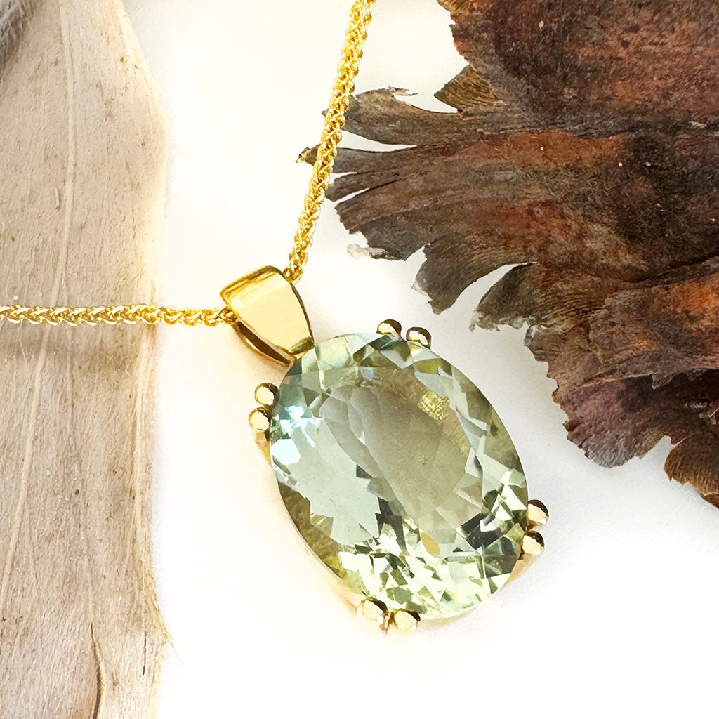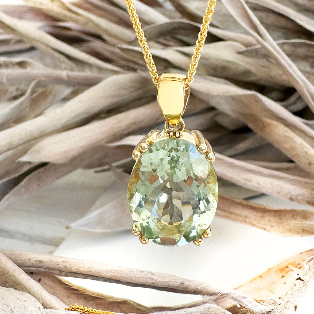 Embrace timeless elegance with this classic pendant. The sage hue of the captivating 8.08-carat green amethyst draws the eye. The exquisite double claw nine-carat yellow gold double claw gives this pendant luxurious sophistication. The design embodies a balance of classic artistry and modern grace, making it a majestic addition to any jewellery collection.