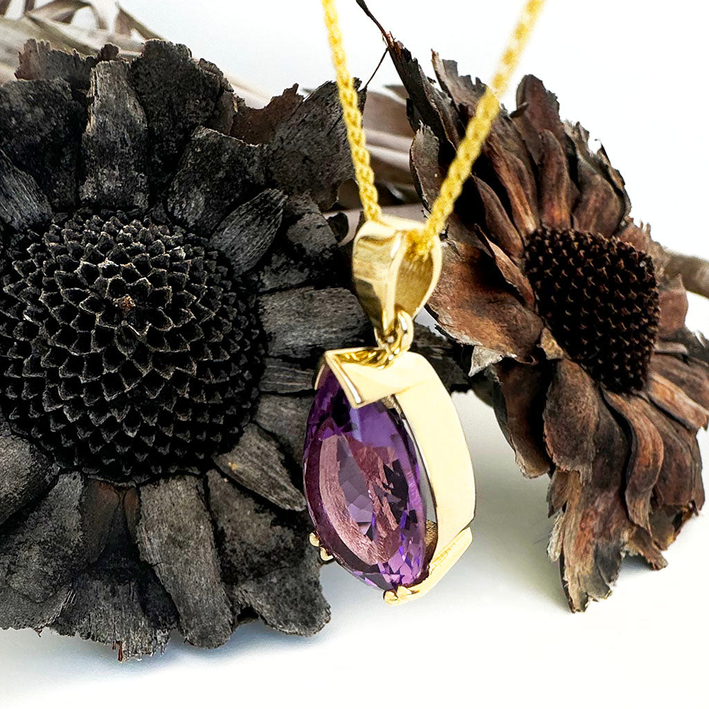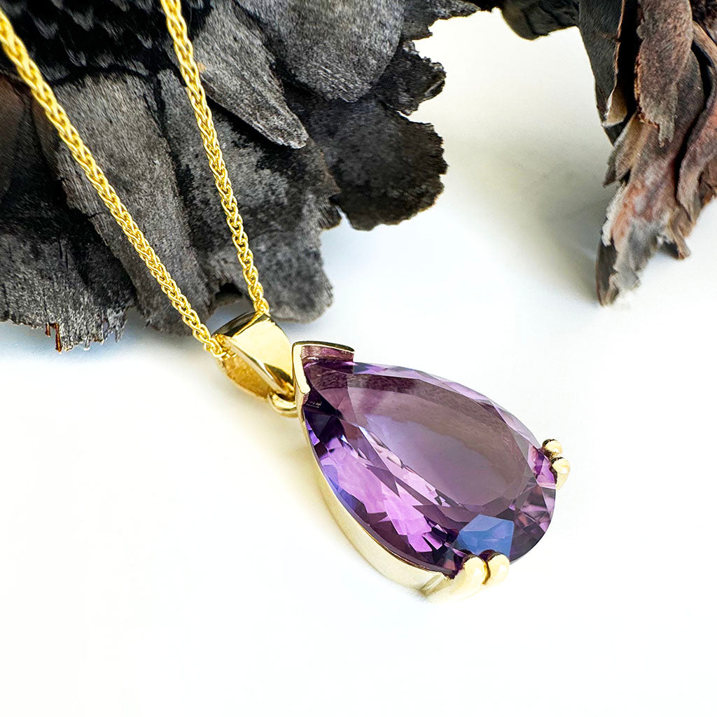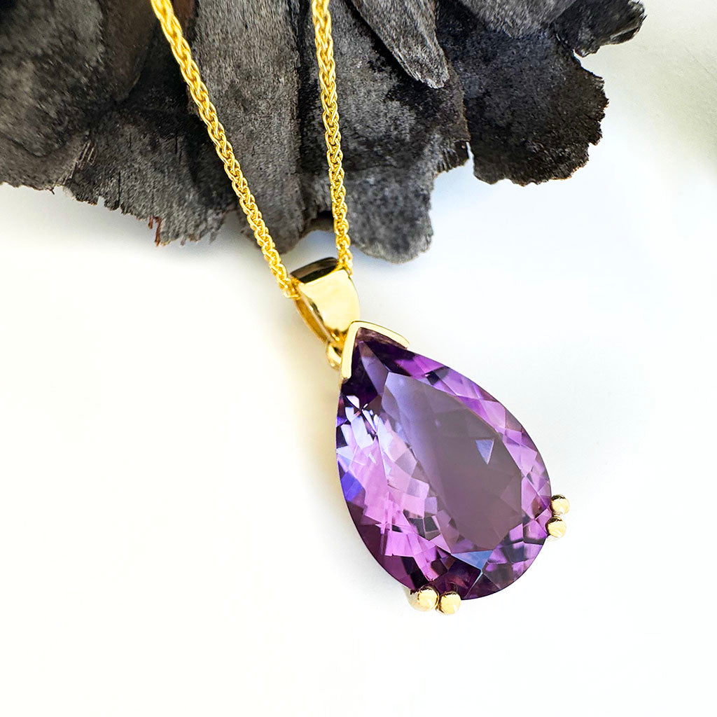 Embrace timeless elegance with this classic pendant. The deep purple of the captivating 10.33-carat pear amethyst draws the eye. The exquisite double claw nine-carat yellow gold double claw gives this pendant luxurious sophistication. The design embodies a balance of classic artistry and modern grace, making it a majestic addition to any jewellery collection.