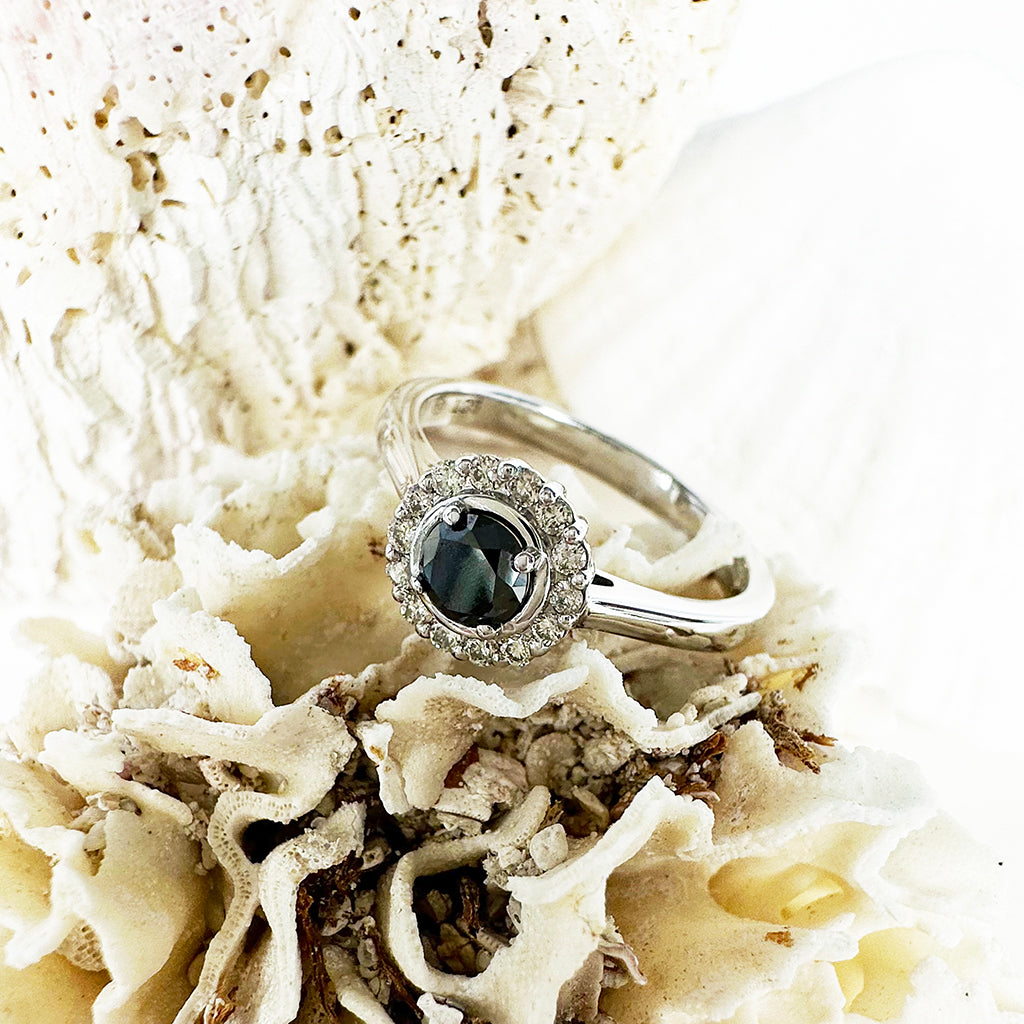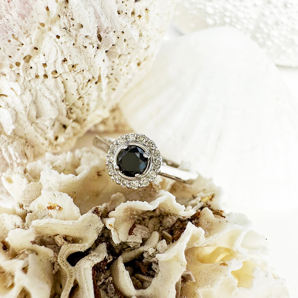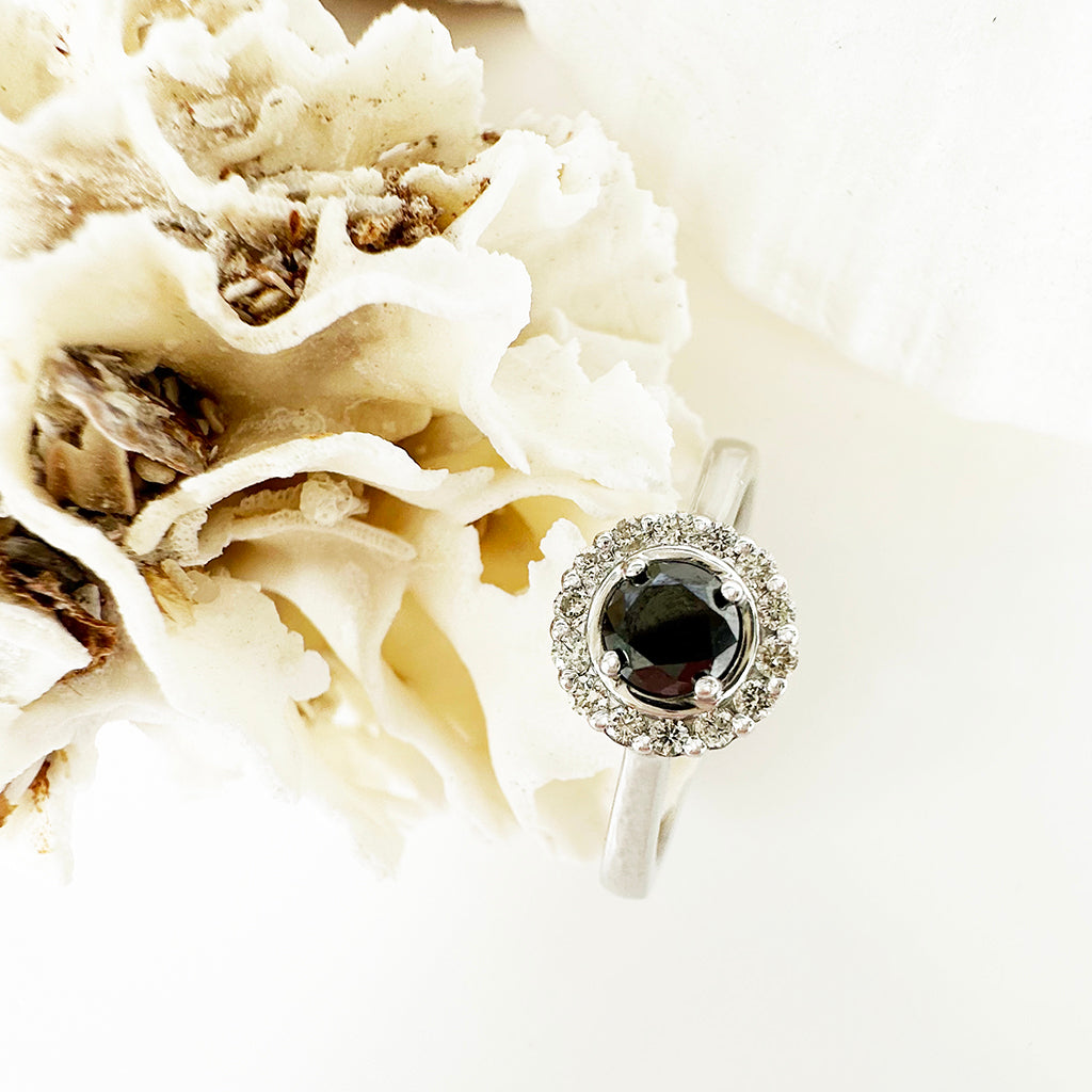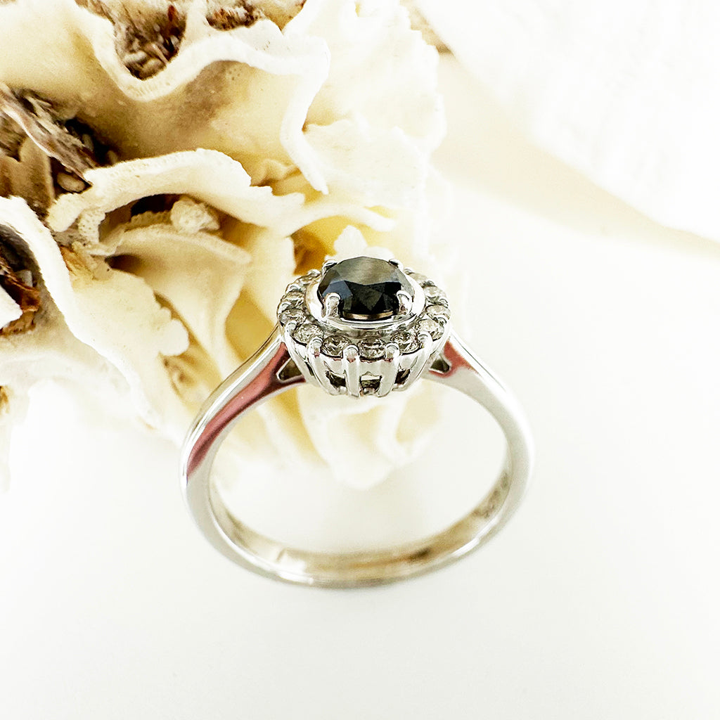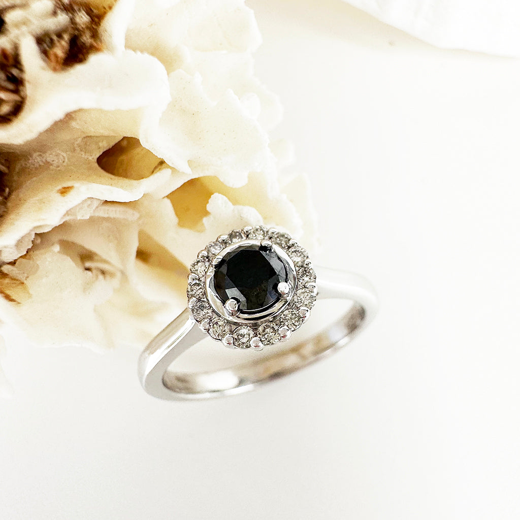 Classic Round Cut Black Diamond With White Diamond Halo Ring
