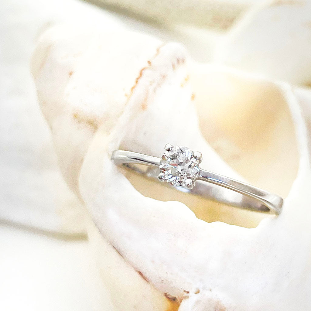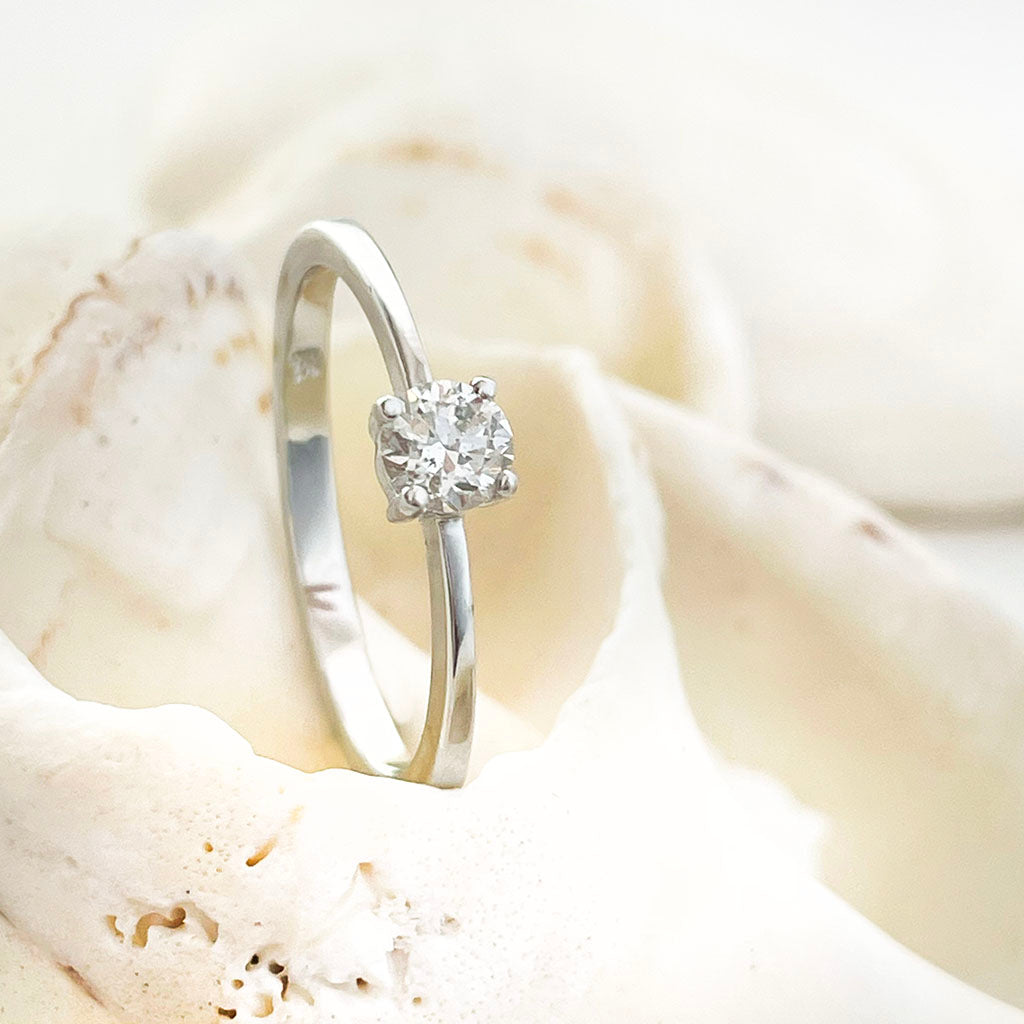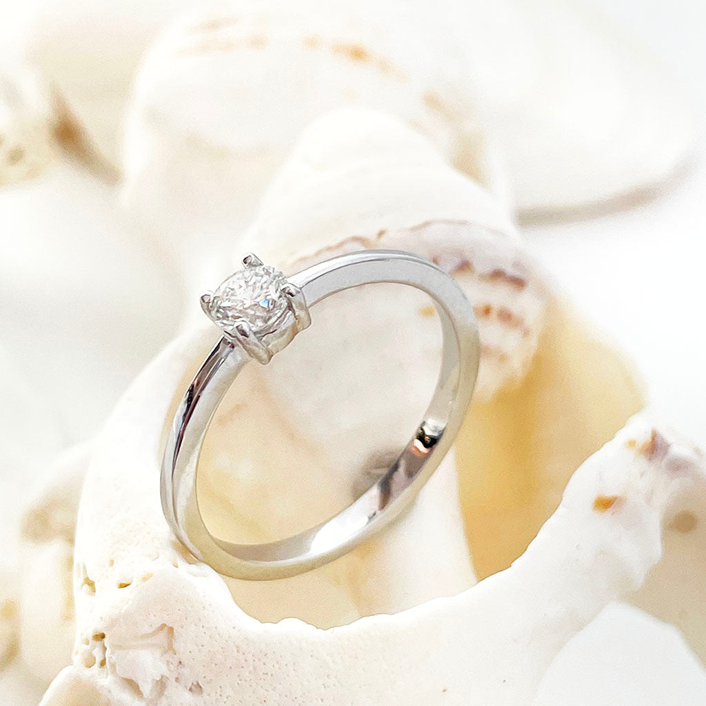 Light as a breeze and refined to perfection, this petite diamond ring is elegance distilled, as close to wearing a beguiling secret as jewellery gets. The gently tapered nine-carat white gold band whispers against the skin, giving full focus to the brilliance of the centre stone.