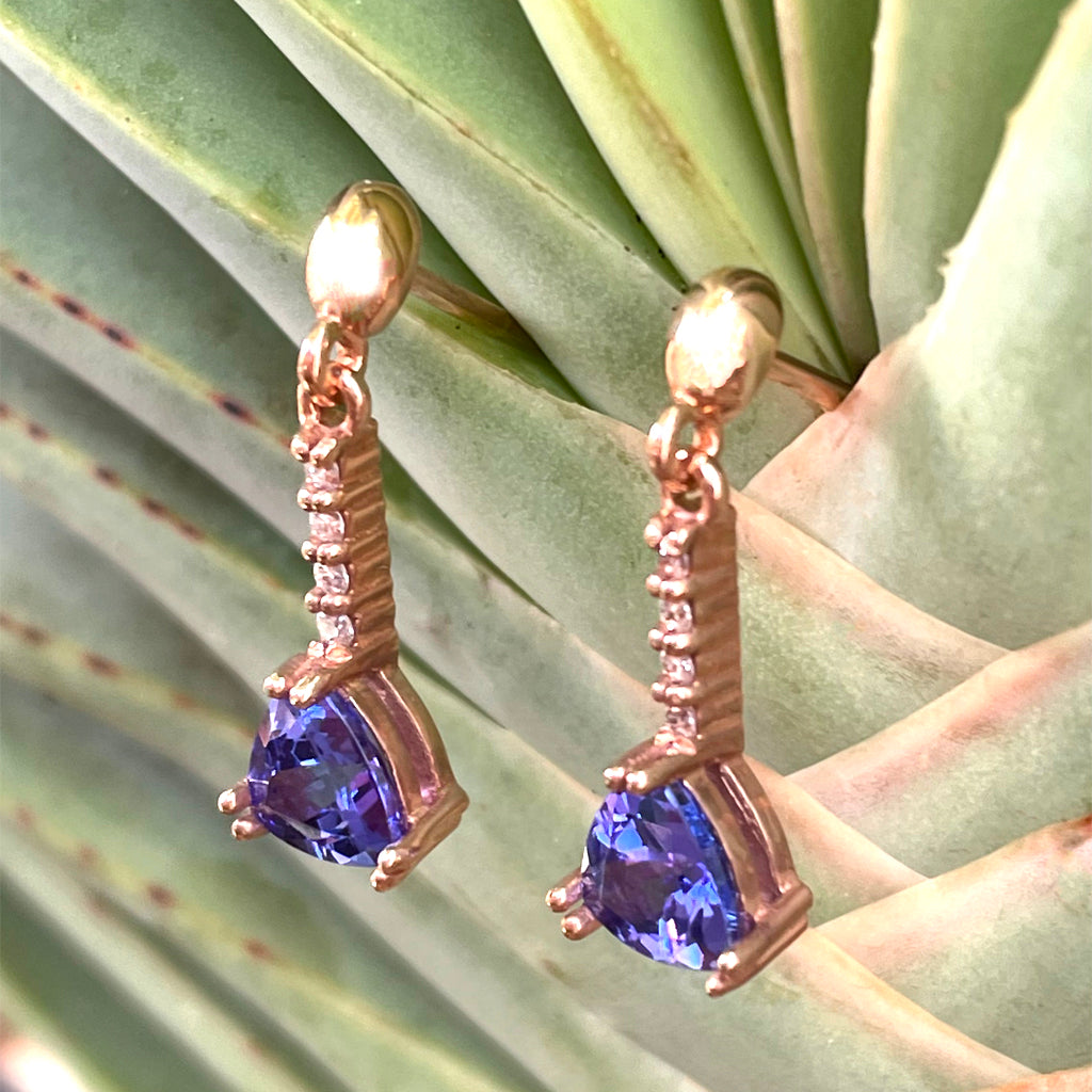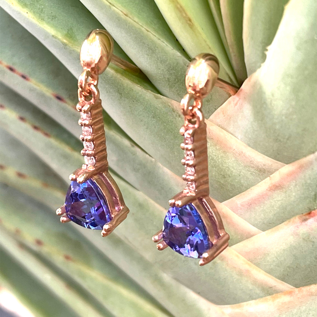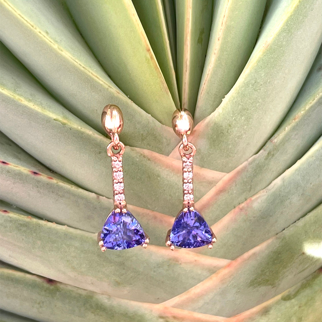Classic Trilliant Cut Tanzanite and Diamond Drop Rose Gold Earrings