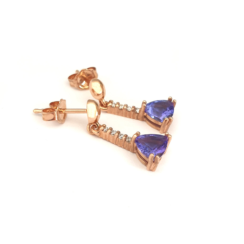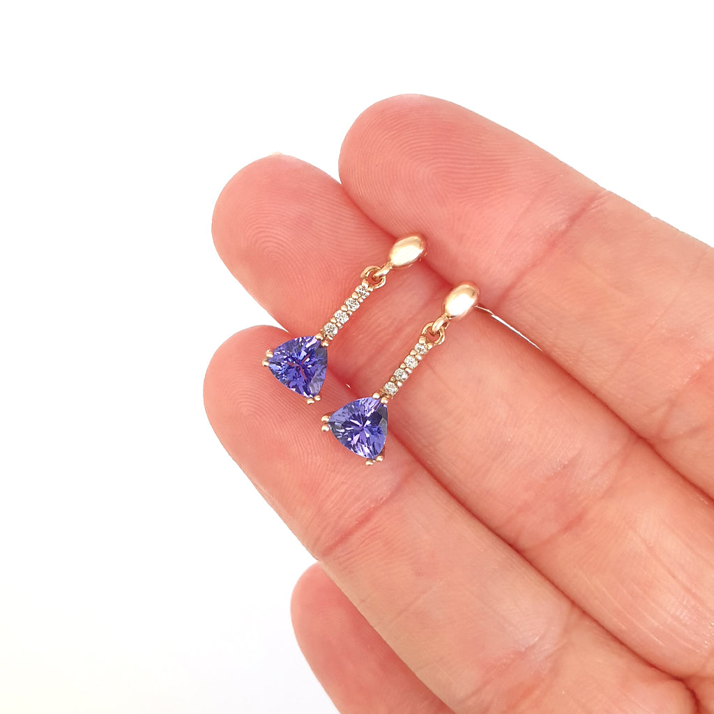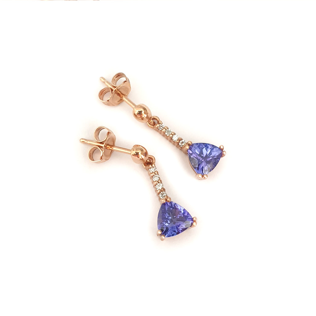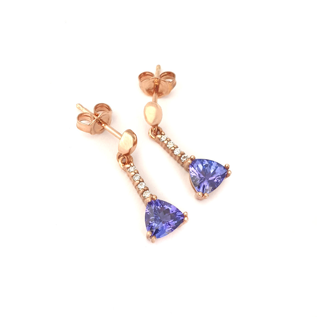 Classic Trilliant Cut Tanzanite and Diamond Drop Rose Gold Earrings