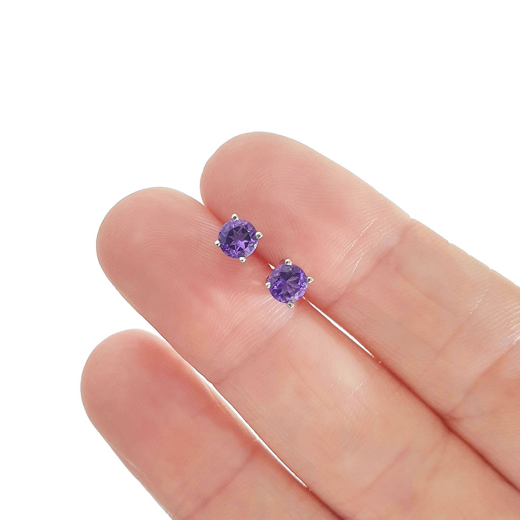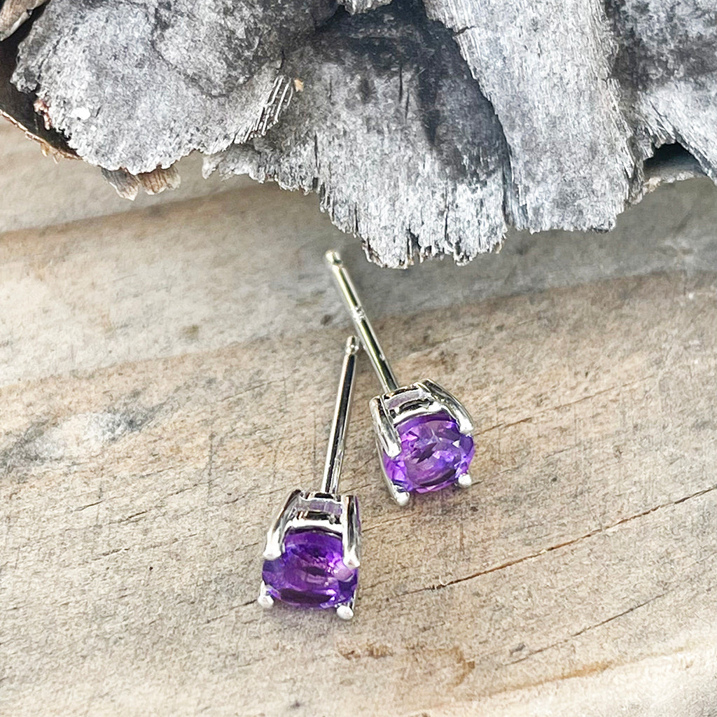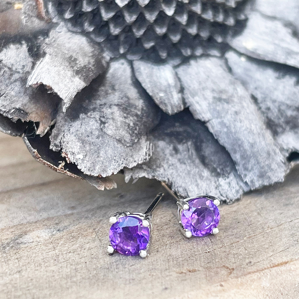Classic White Gold Four Claw Round Cut Amethyst Studs