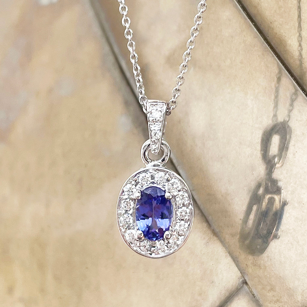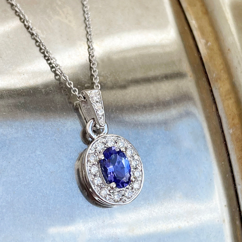 Classically Elegant Oval Tanzanite and Diamond Halo Pendant