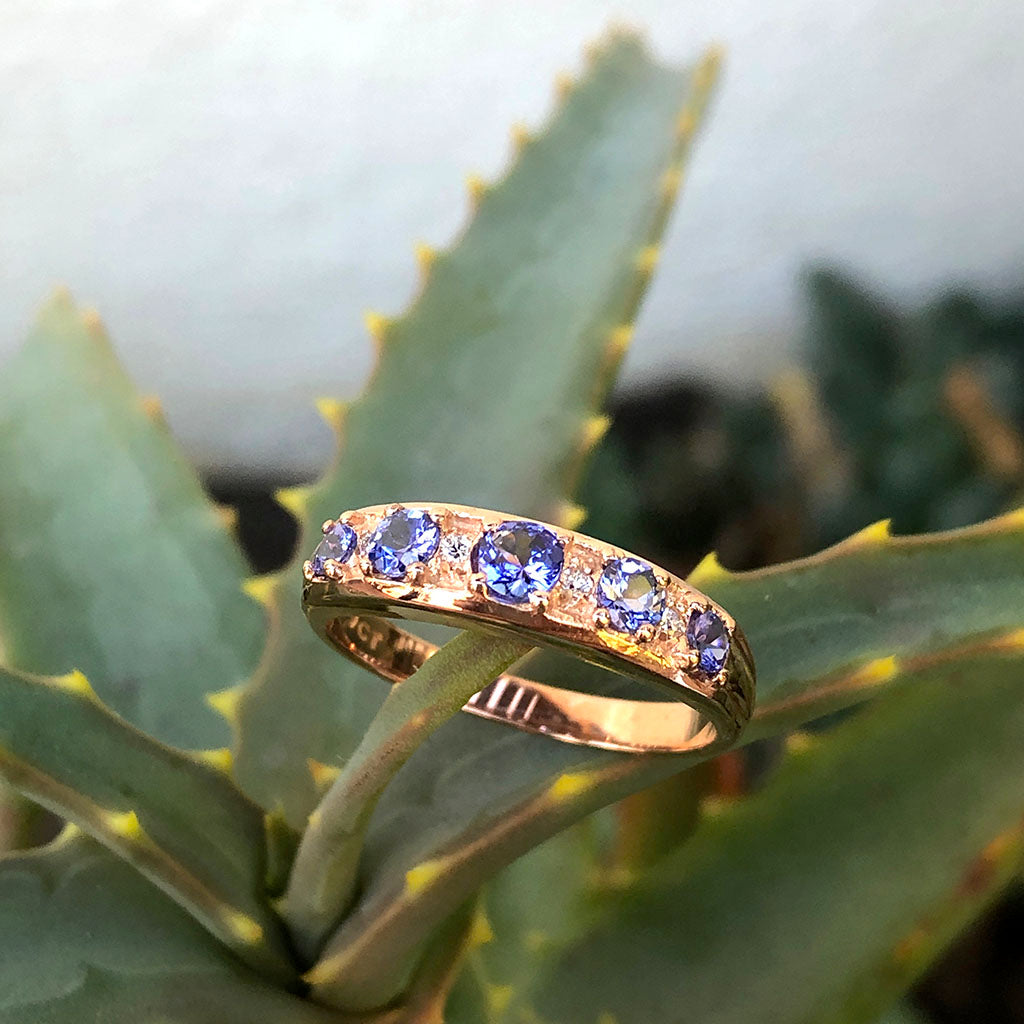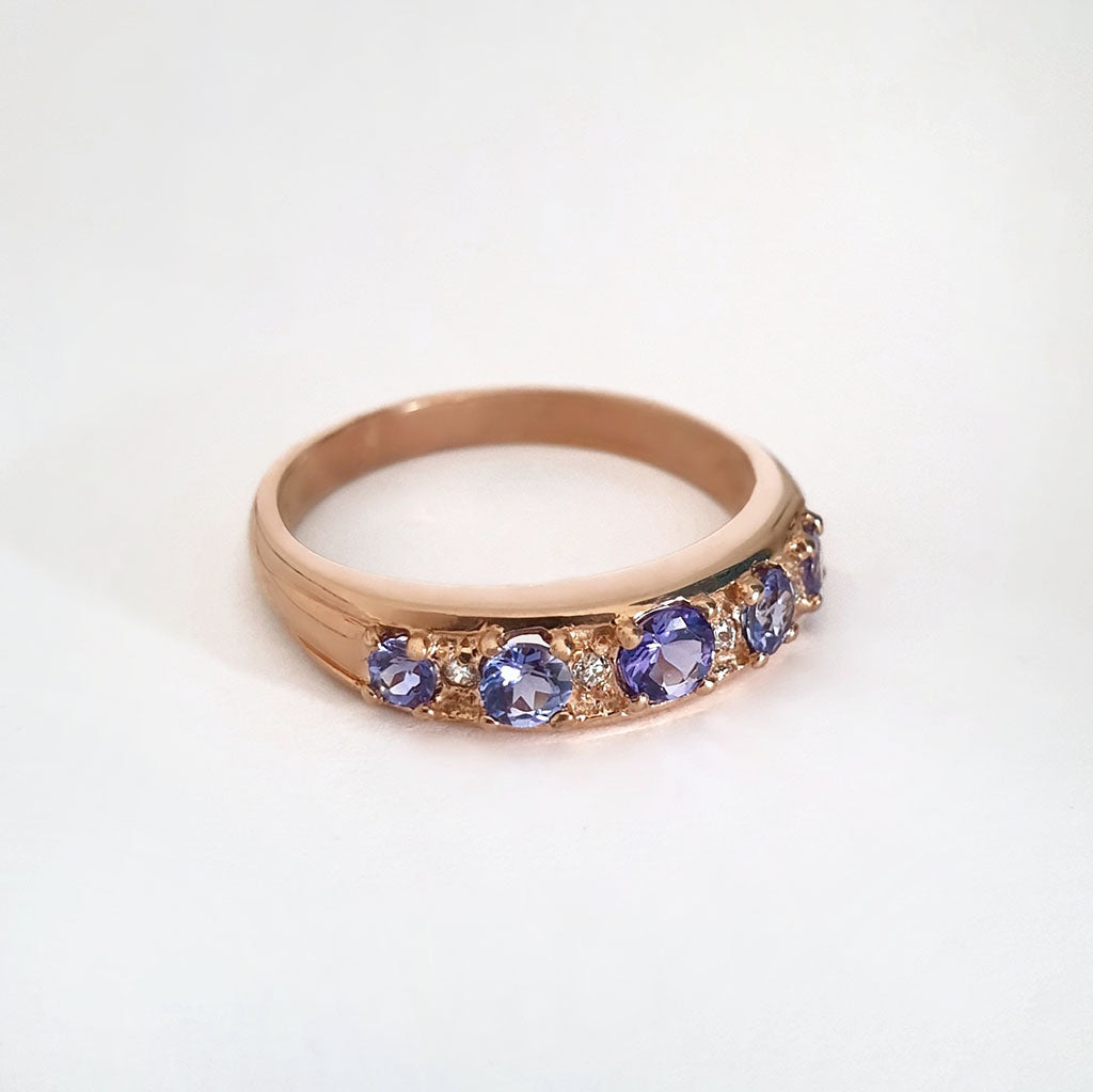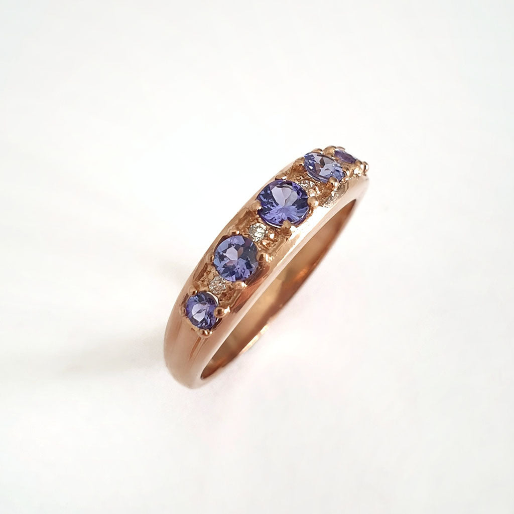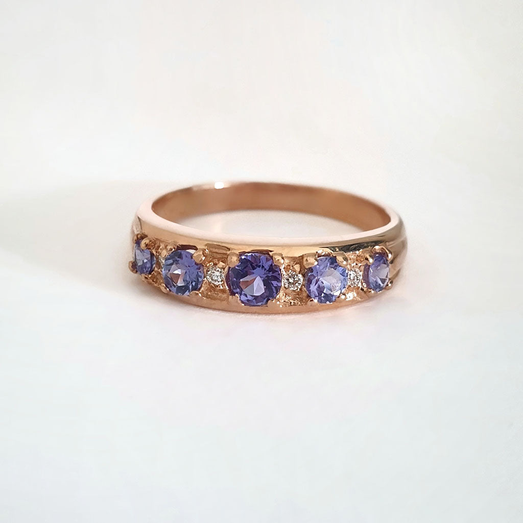 Contemporary Five Tanzanite and Four Diamond Rose Gold Ring