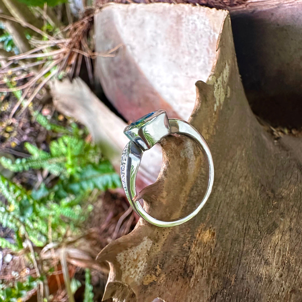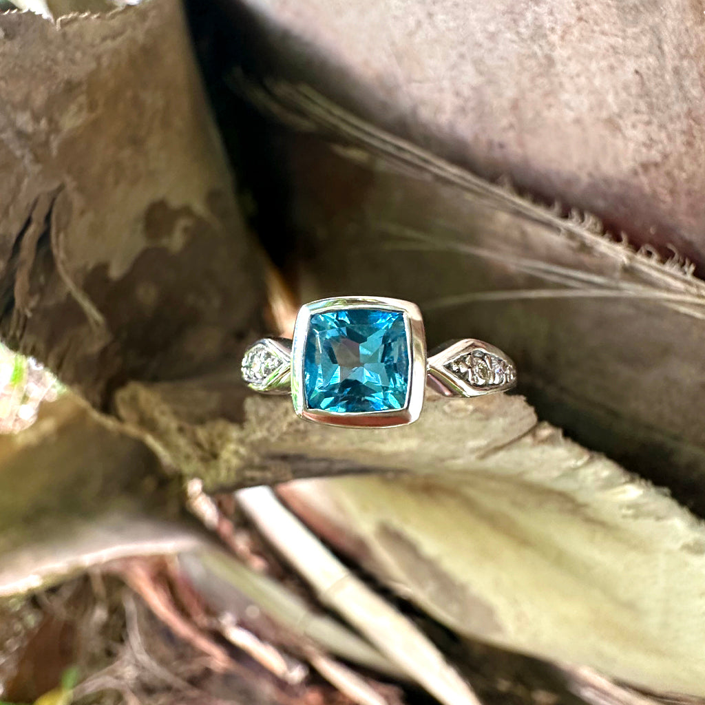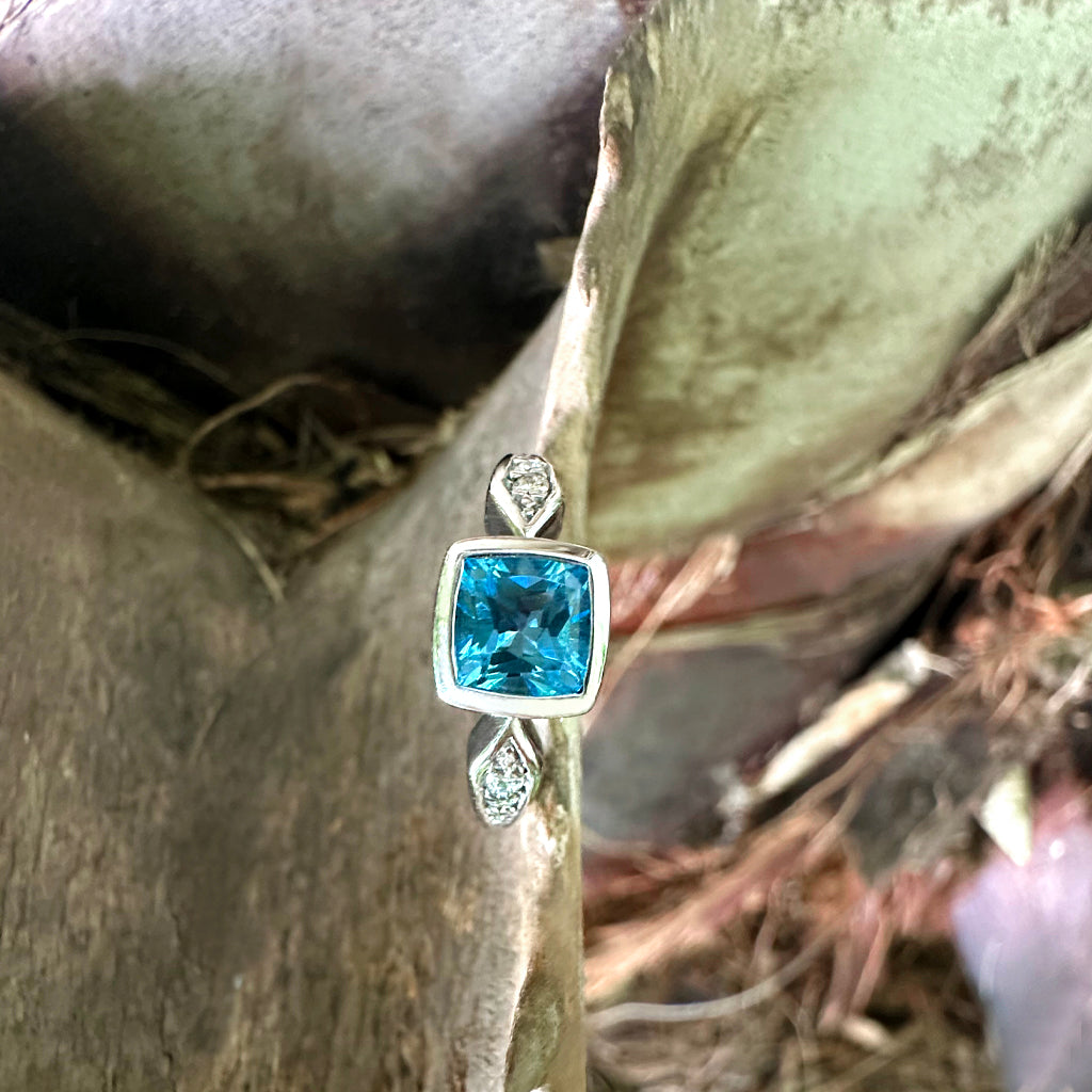 Contemporary Square Cushion Cut Blue Topaz With Diamond Shoulder Detail Ring