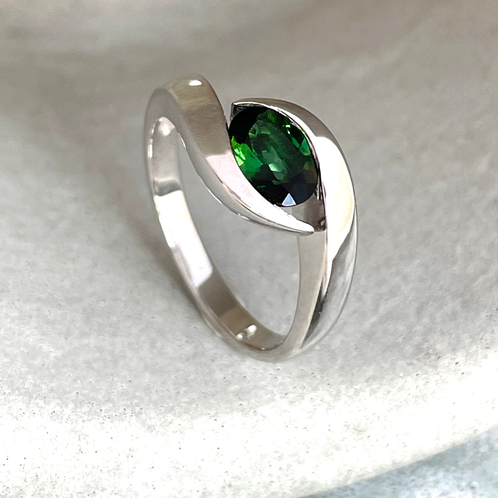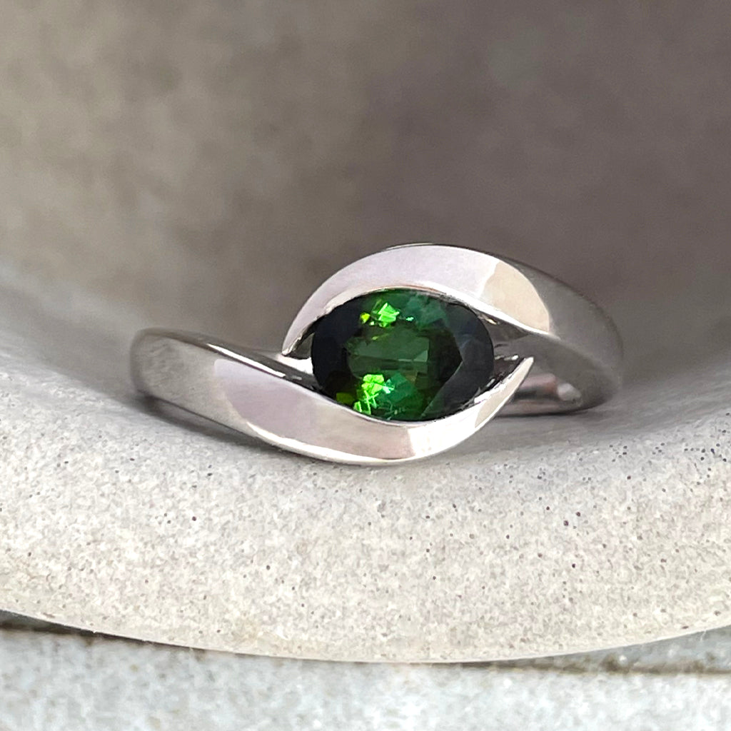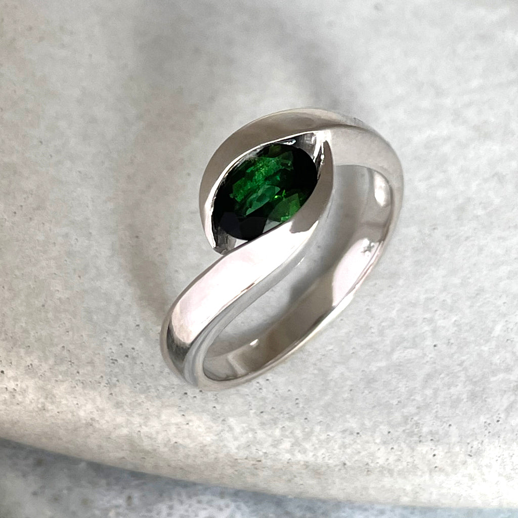 Meet your new favourite statement piece. This curvy white gold ring wraps around a lush green tourmaline like a protective shield — strong, stylish, and a little bit mysterious. With its split band design, each curve flows toward the gemstone, making it feel like a modern amulet for love and protection.