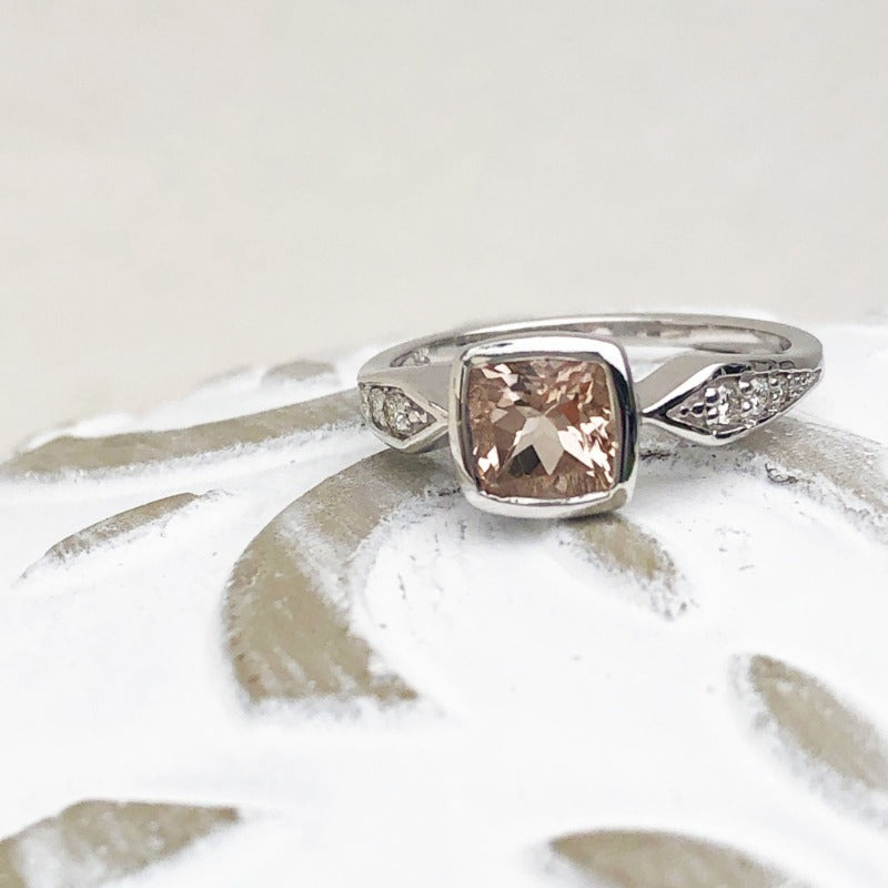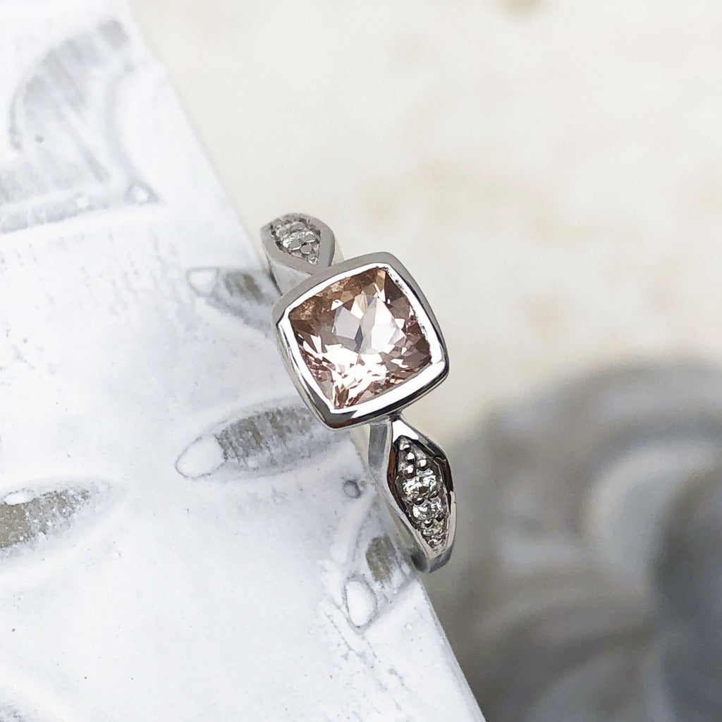 Cushion Cut Morganite Ring Tapered Diamond Shoulders