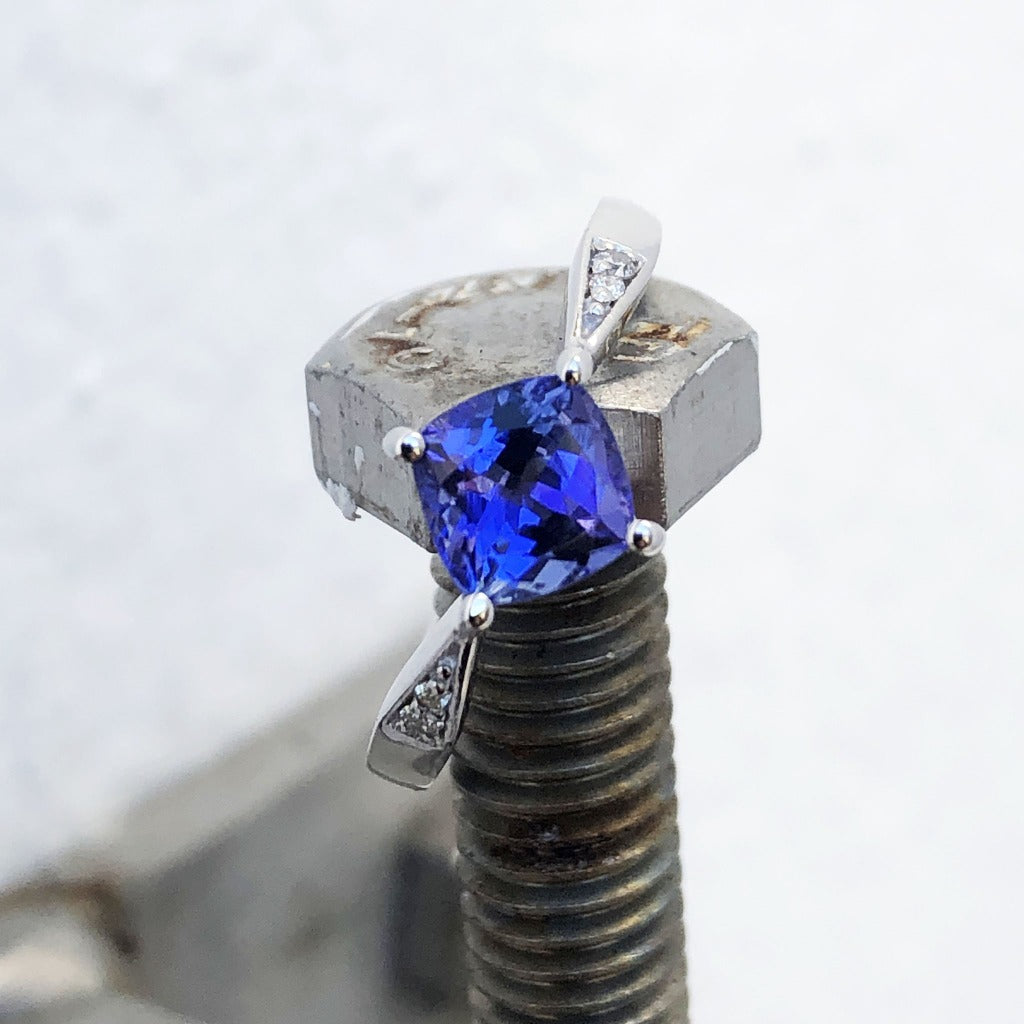 Centre Stone: Tanzanite; weight: 1.21ct: cut: cushion colour: blue/violet, intense; clarity - Eye clear