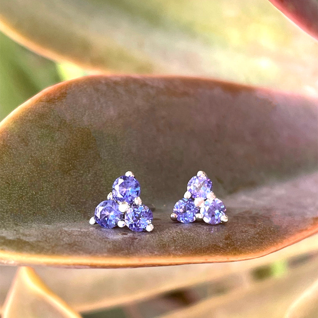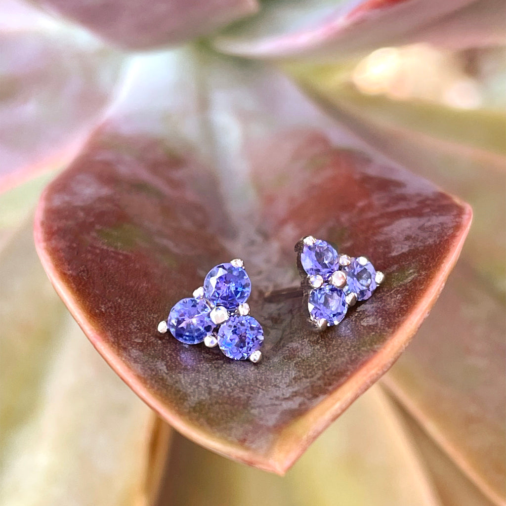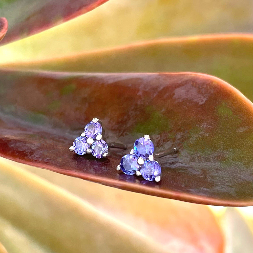 These delightful tanzanite and white gold stud earrings remind one of the seedlings of magical flowers. They're crafted in nine-carat white gold and each earring is set with a trilogy of round cut tanzanites.