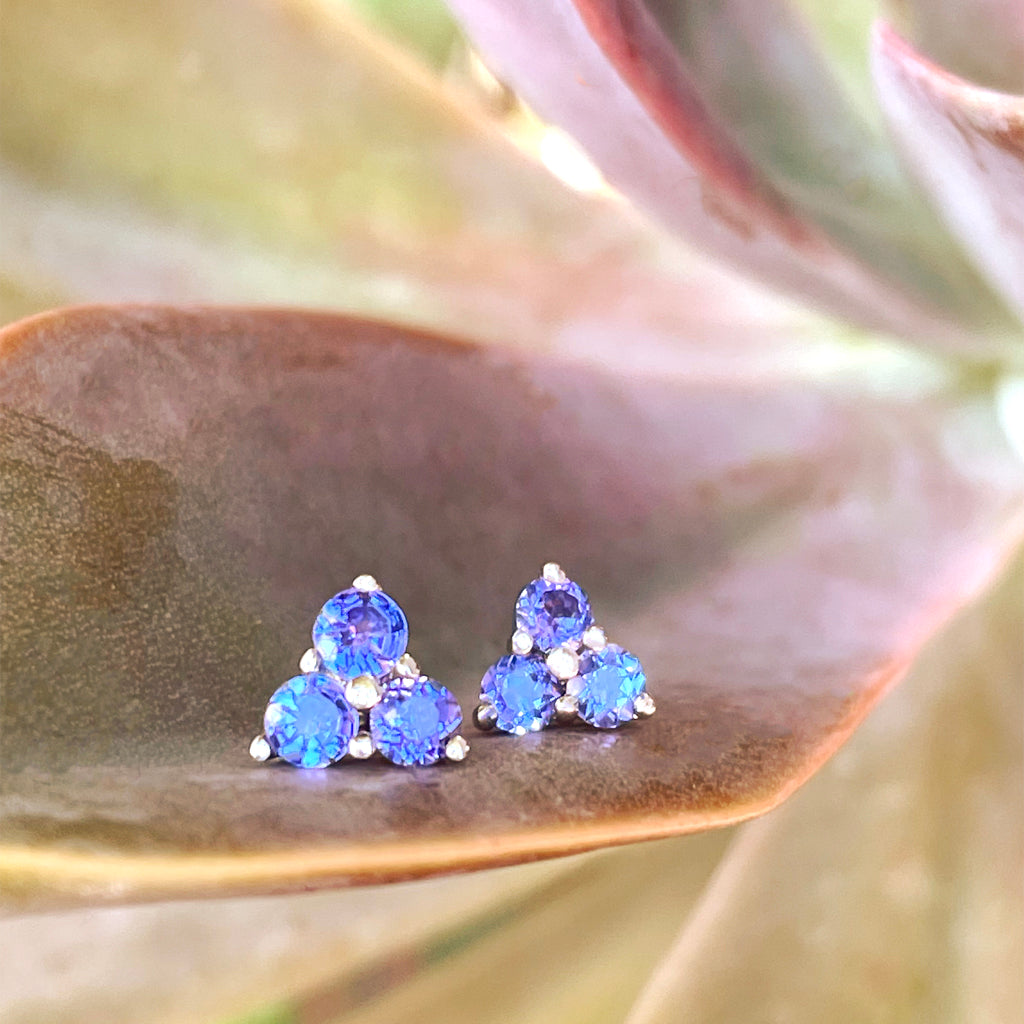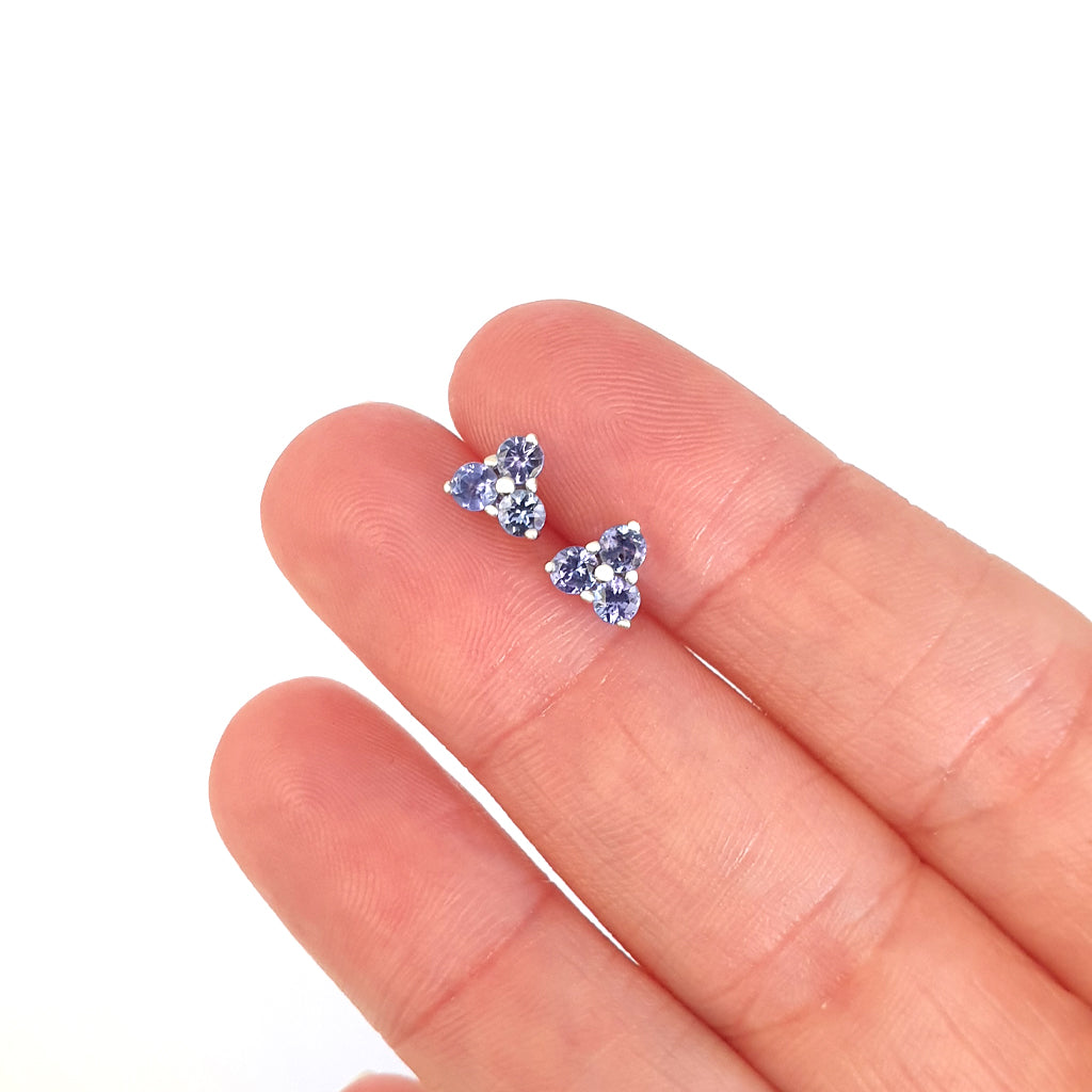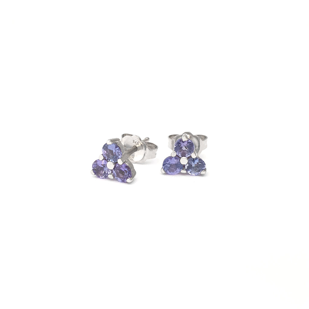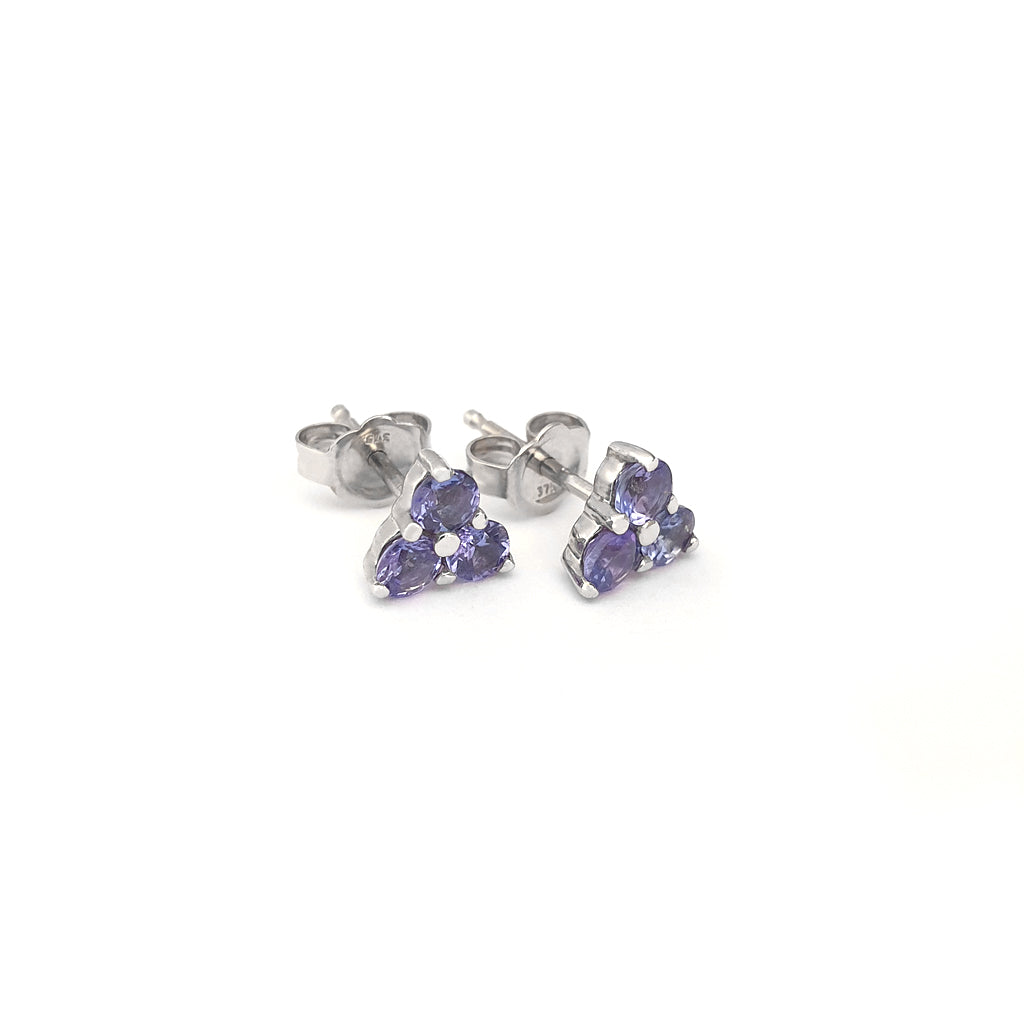 These delightful tanzanite and white gold stud earrings remind one of the seedlings of magical flowers. They're crafted in nine-carat white gold and each earring is set with a trilogy of round cut tanzanites.