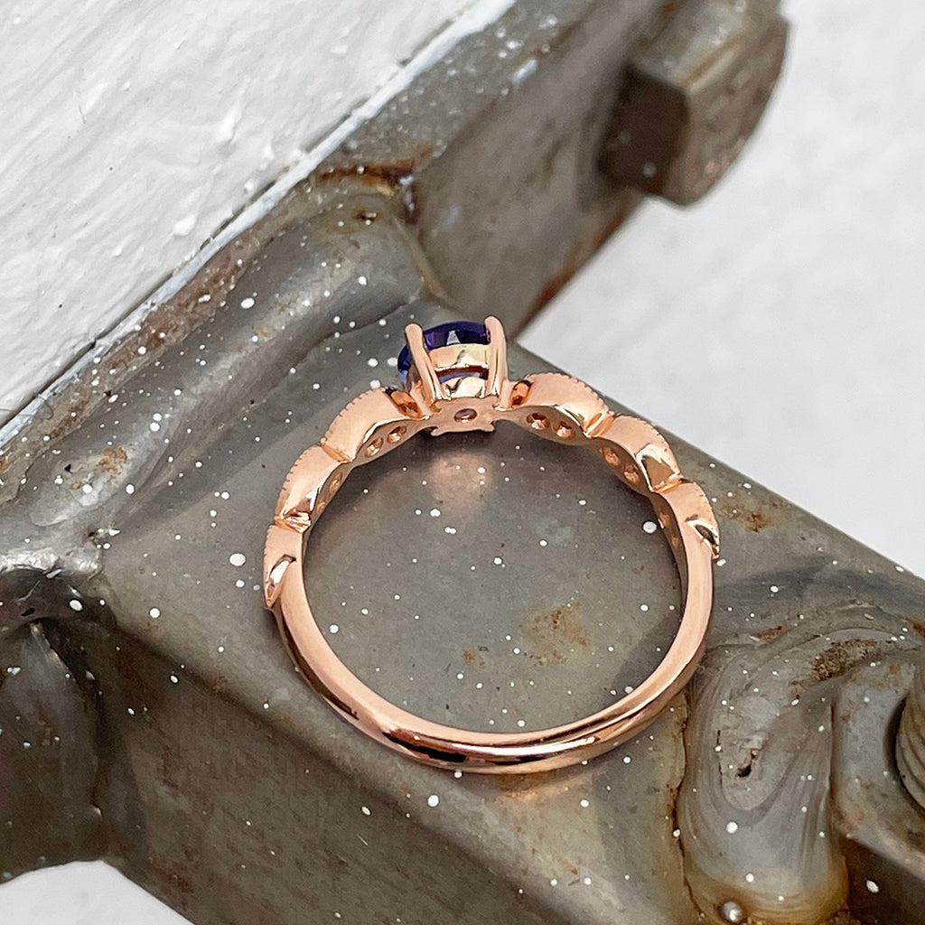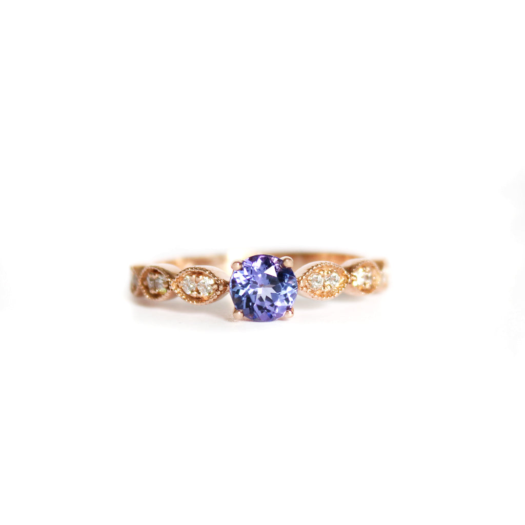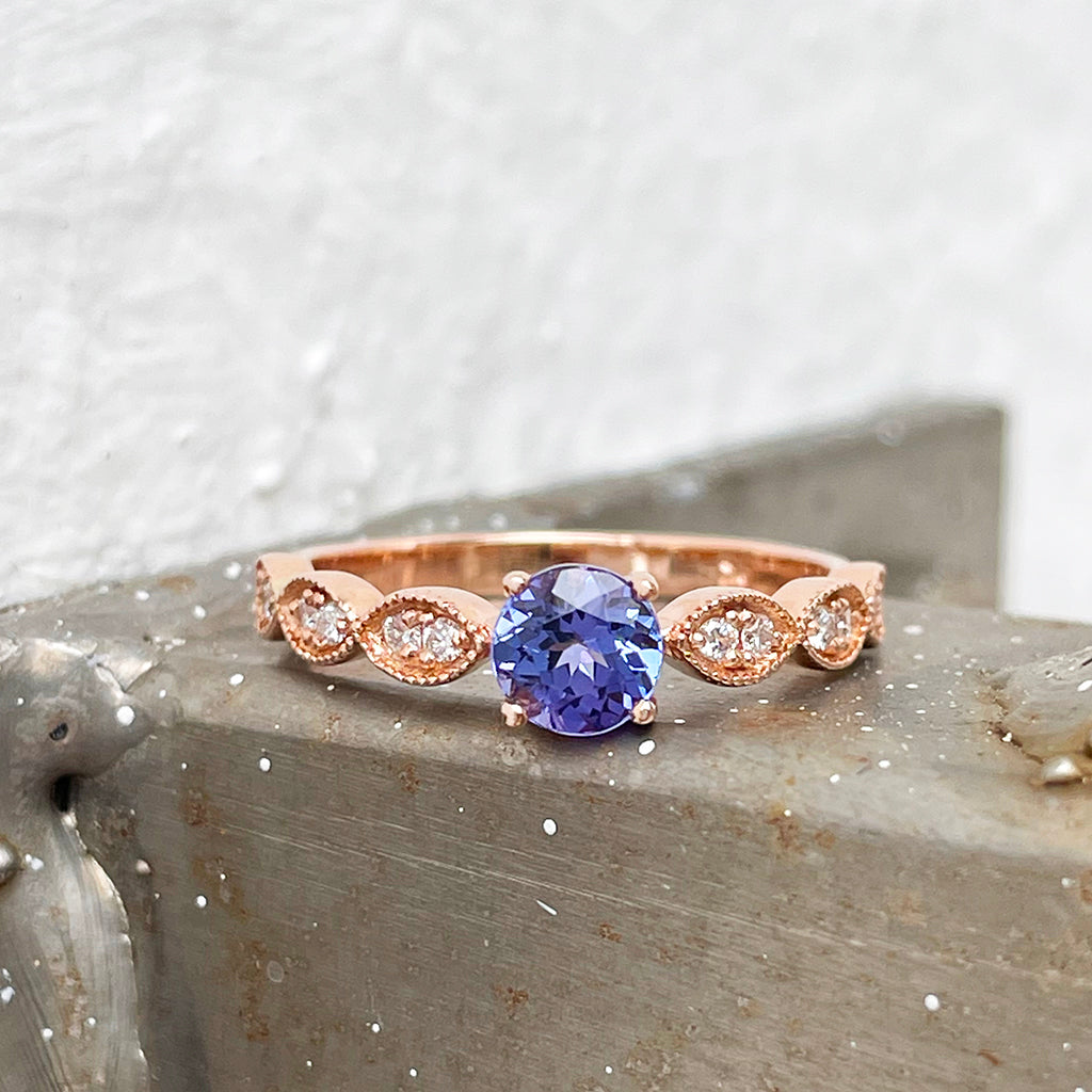 Delectable Double Diamond Filigree Crimped Band Round Cut Tanzanite Rose Gold Ring
