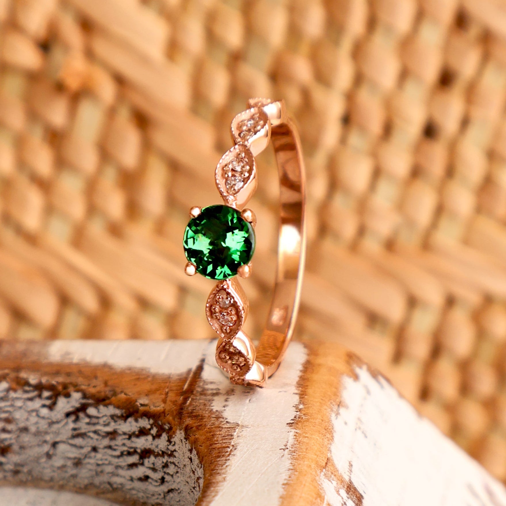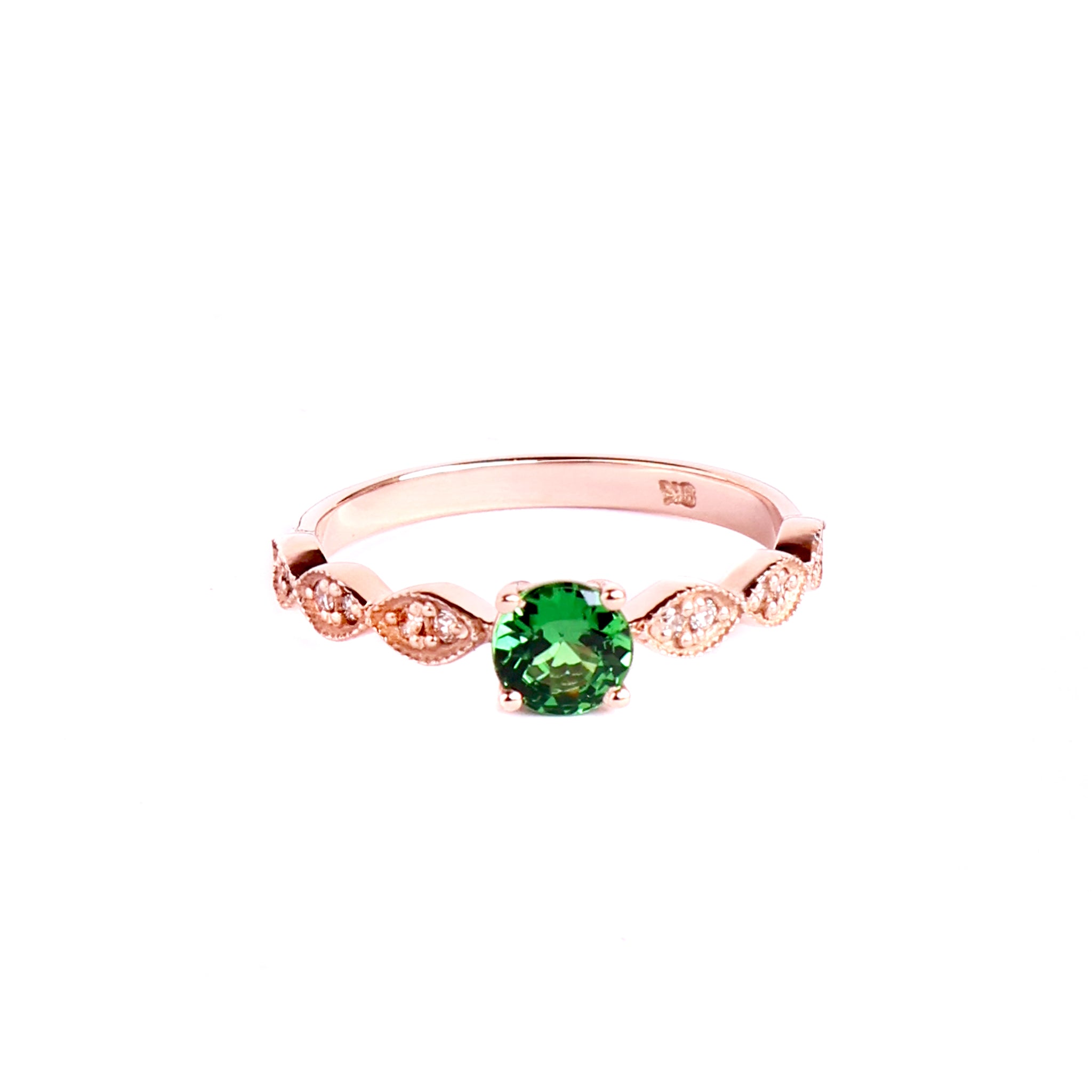 Delectable Double Diamond Filigree Crimped Band Round Cut Tsavorite Rose Gold Ring