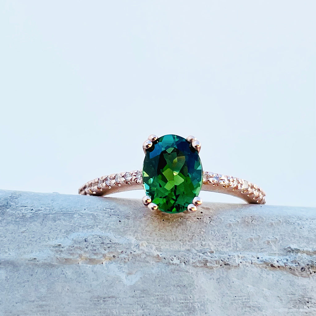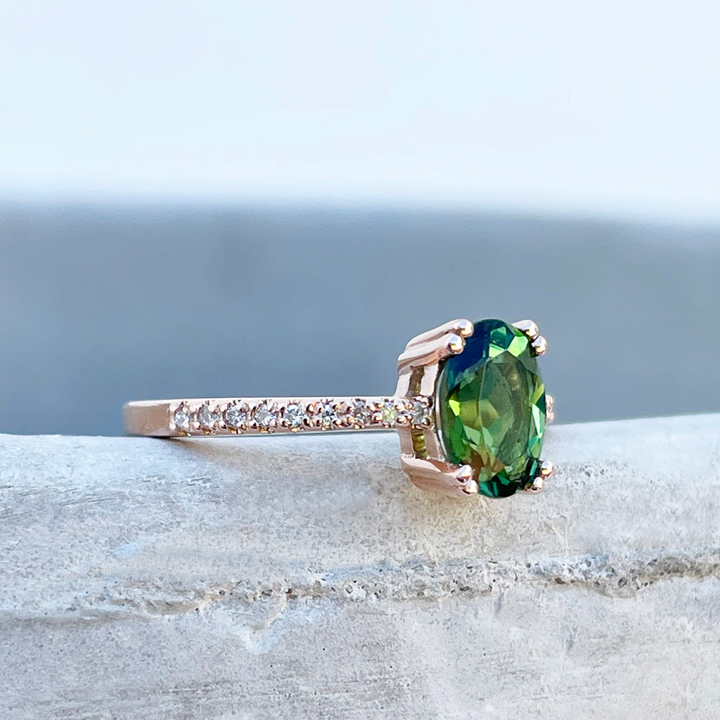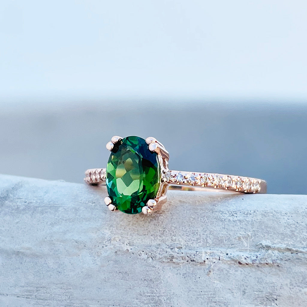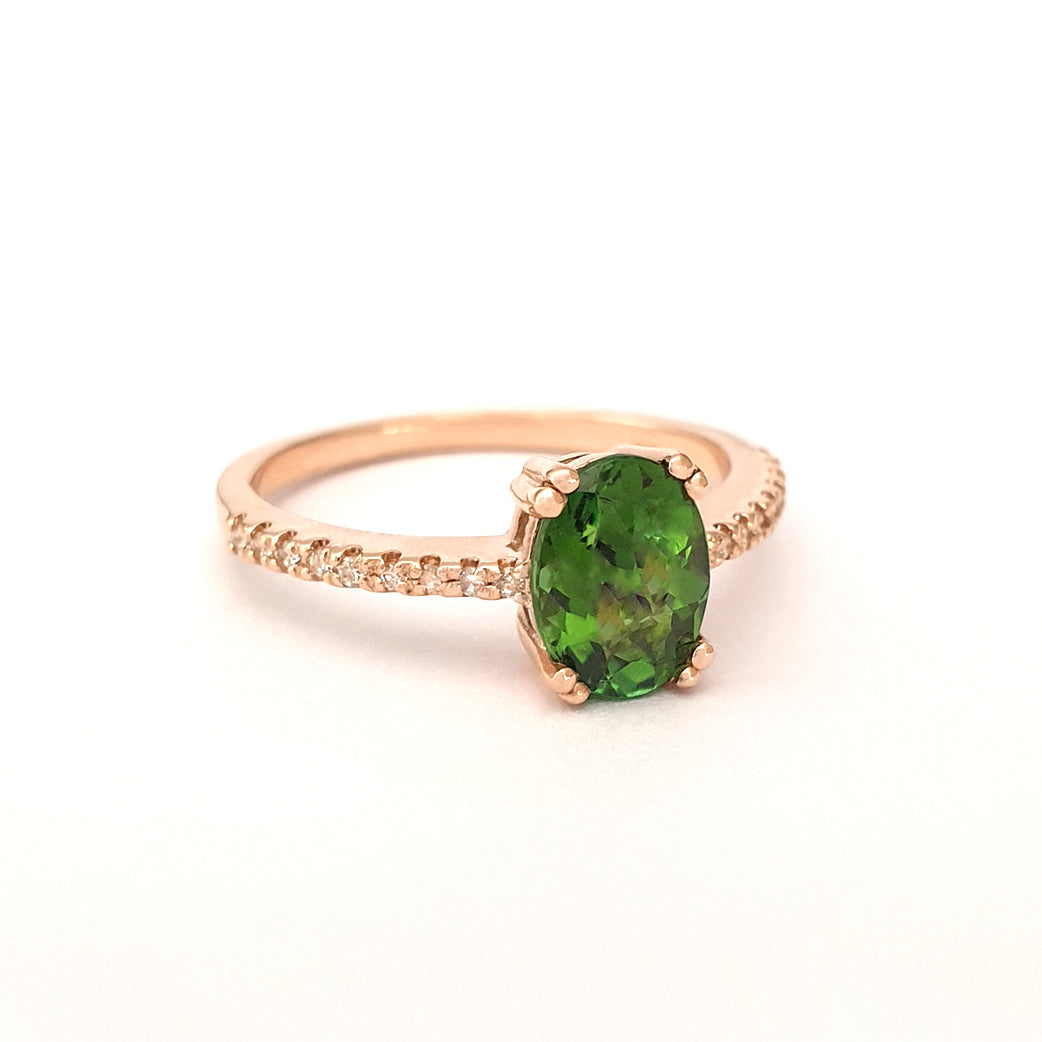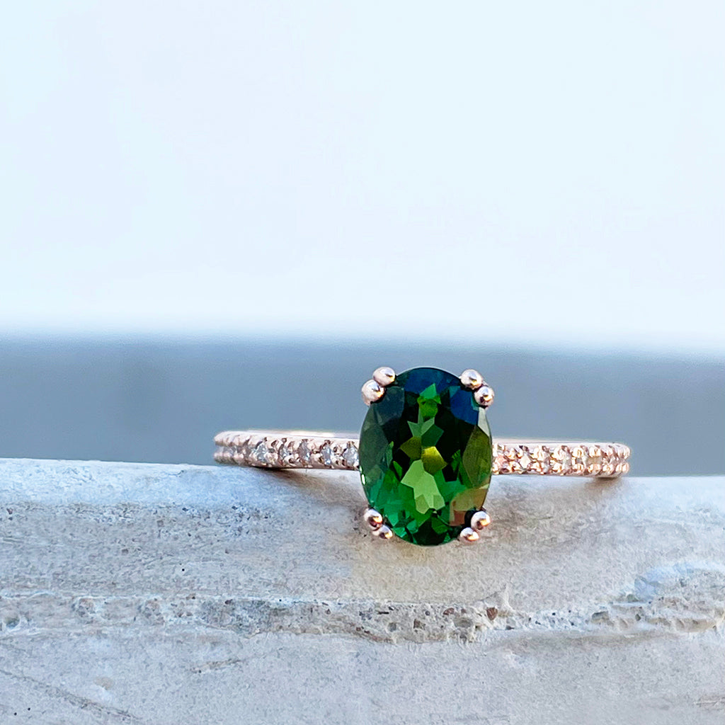 Delicate Oval Green Tourmaline with Diamond Band Ring