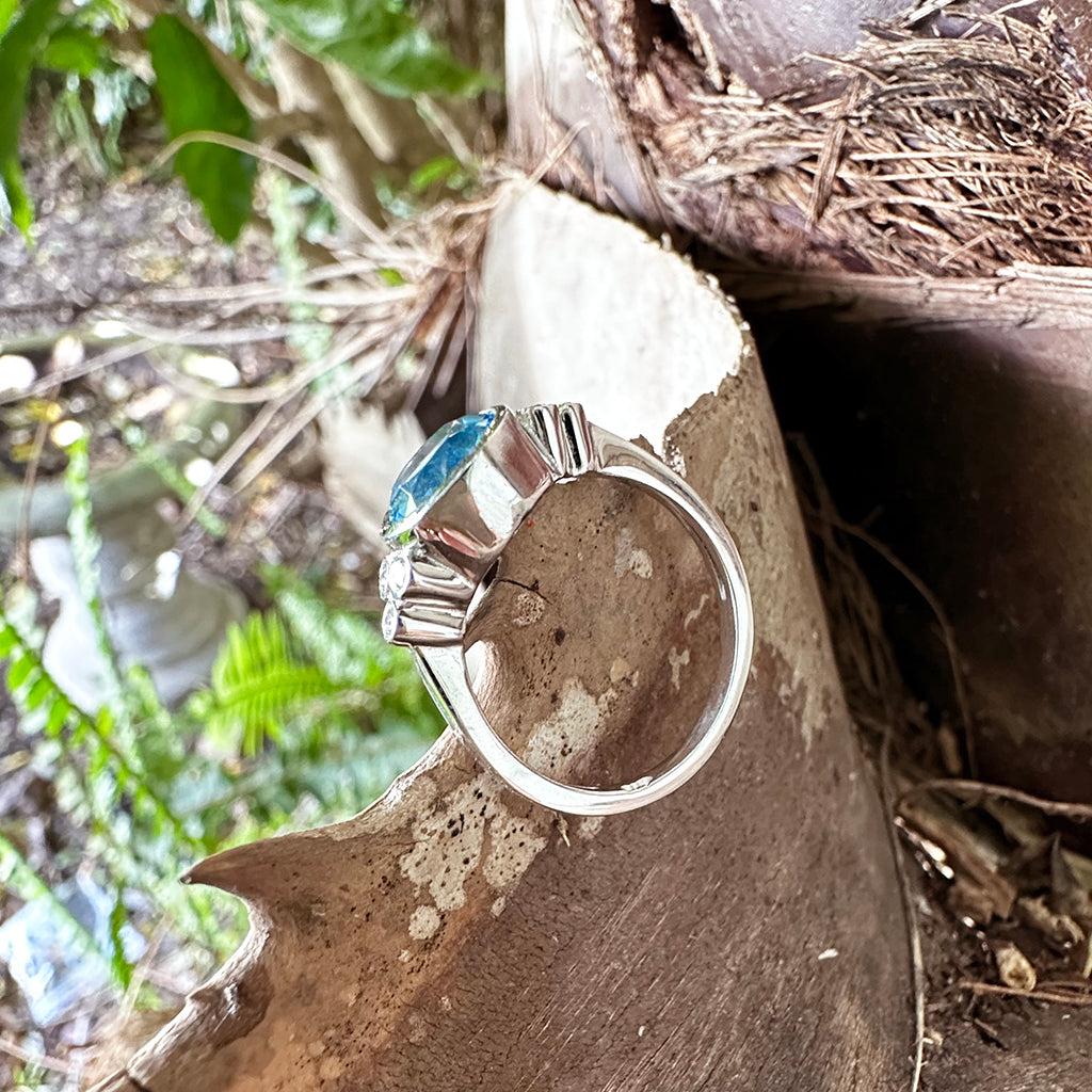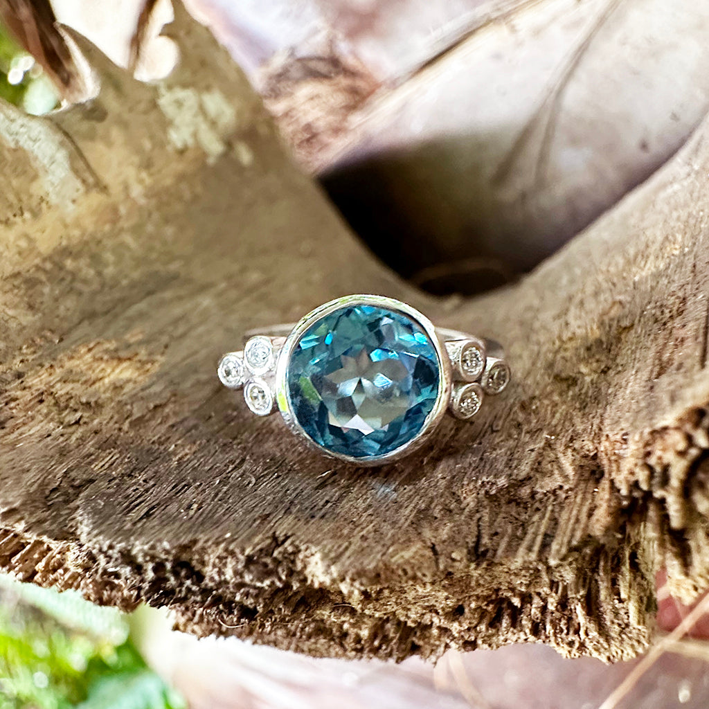 Delicately Bezel Set Blue Topaz with Trilogy Shoulder Diamond Highlight White Gold Ring