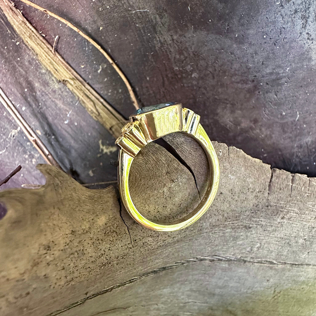 Delicately Bezel Set Blue Topaz with Trilogy Shoulder Diamond Highlight Yellow Gold Ring
