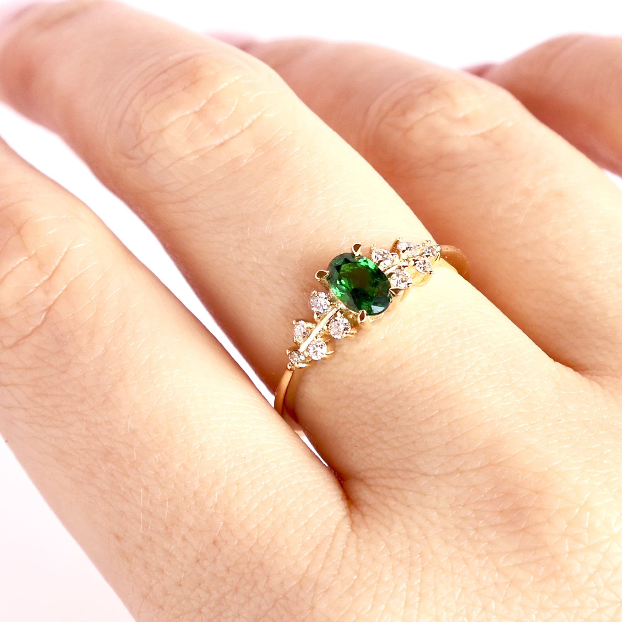 This captivating ring draws its beauty from nature’s quiet grandeur. A vivid oval-cut Tsavorite takes centre stage, its forest-green brilliance framed by cascading clusters of white diamonds, flowing like delicate leaves along a golden branch.