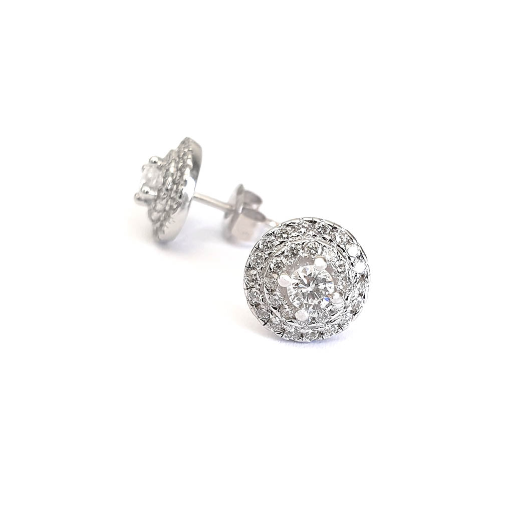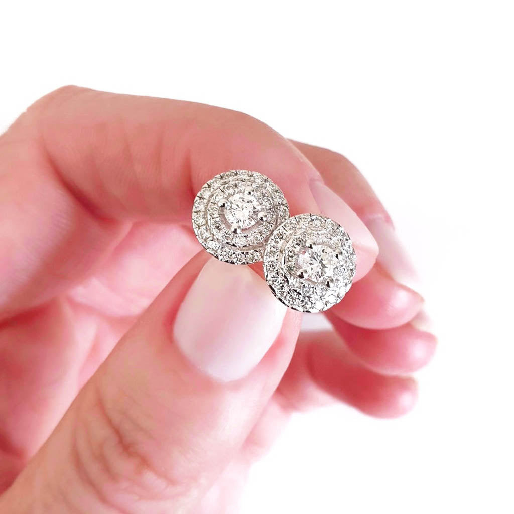 Sparkling diamond cluster earrings featuring a central round cut white diamond surrounded by a double diamond halo of diamonds.