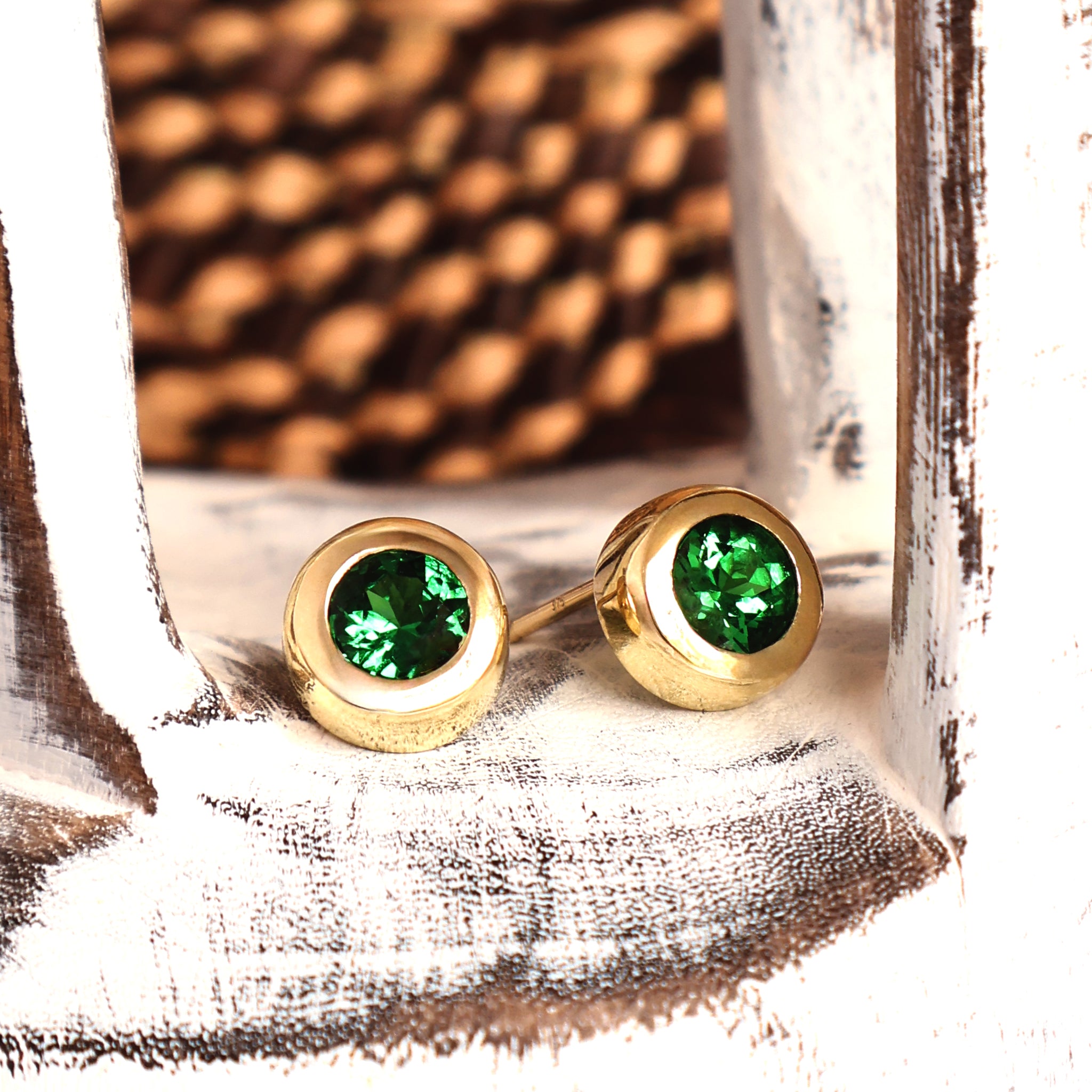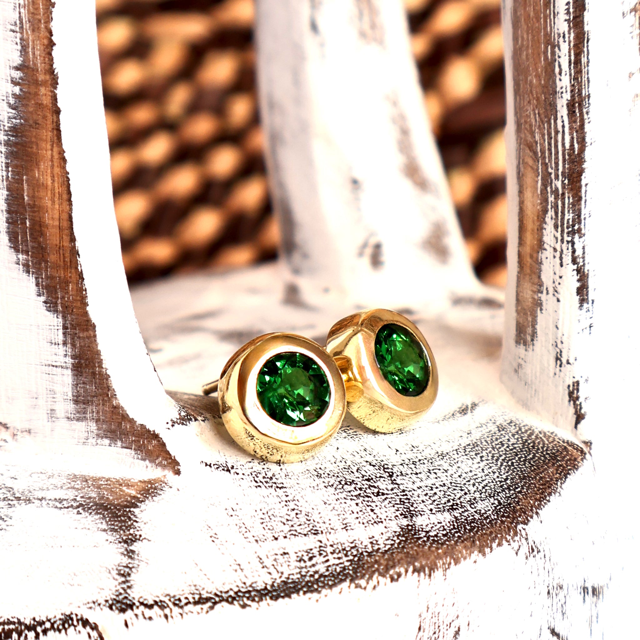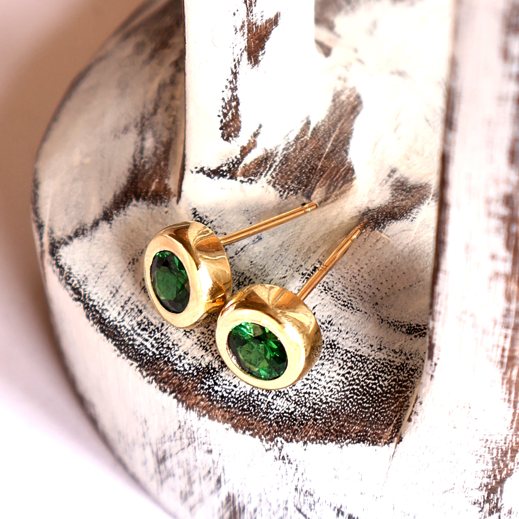 Divinely Deep Green Bezel Set Tsavorite Yellow Gold Studs